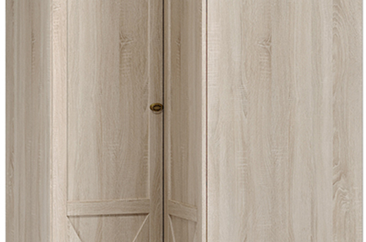 Шкаф угловой с рядом полок, регулируемых по высоте, и стационарной штангой наиболее практичен. Такая модель эффективно использует пространство вдоль стен помещения, он как будто состоит из двух шкафов поставленных друг к другу под углом 90 градусов. Петли с углом открывания 165 градусов позволяют комфортно пользоваться наполнением шкафа. Ручка предусмотрена только для одного фасада, второй фасад открывается за торец. Цоколь и крестообразная раскладка на фасадах подчеркивают стиль Прованс.