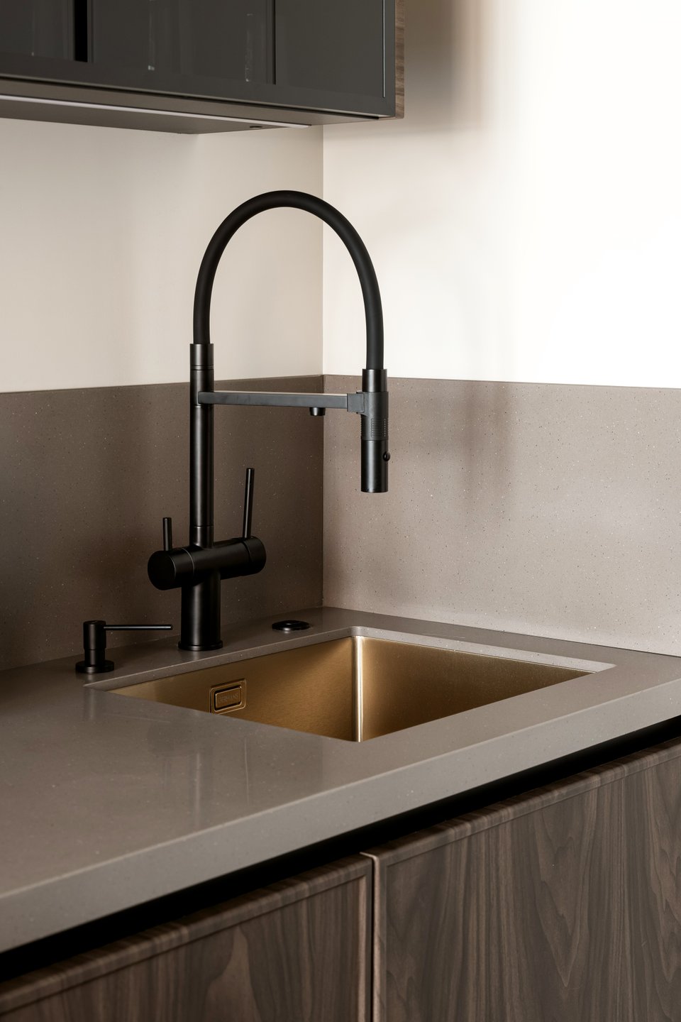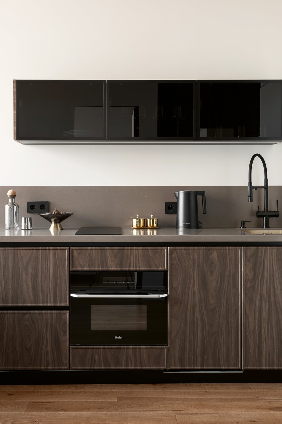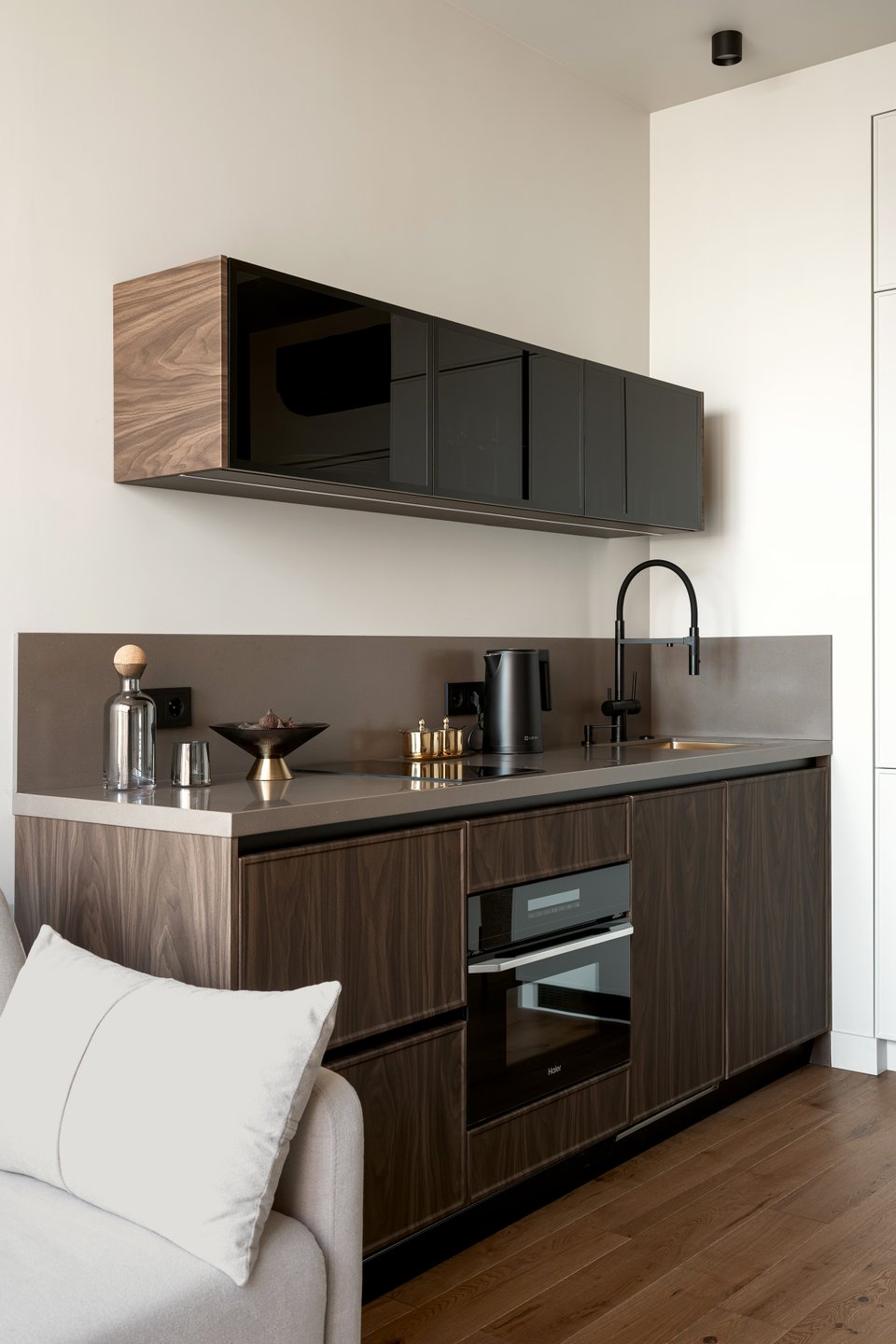Гарнитур изготовили на заказ. Холодильник разместили в зоне кухни, добавили секцию вертикального хранения. Верхний ярус визуально облегчили, спрятали встроенную сушку в нижних шкафах. Фасады под дерево — МДФ в пленке Greenwood «Орех Американский мокко», светлые фасады — МДФ в пленке Greenwood «Кварц Грей». Столешница и стеновая панель выполнены из искусственного акрилового камня.