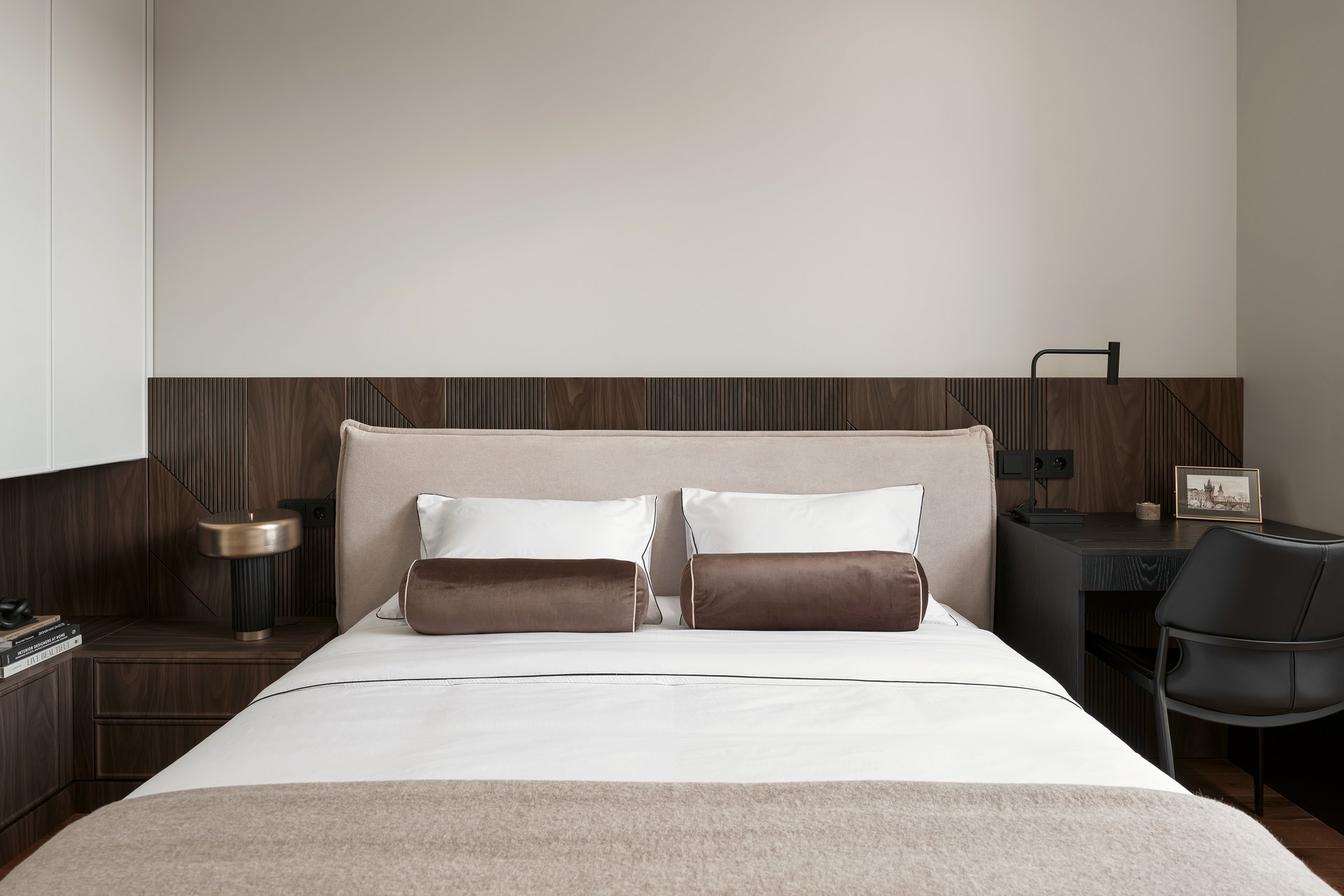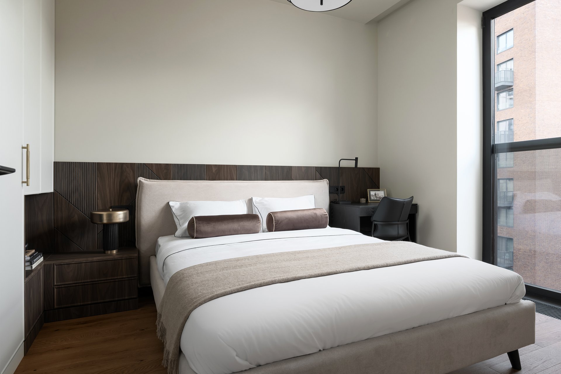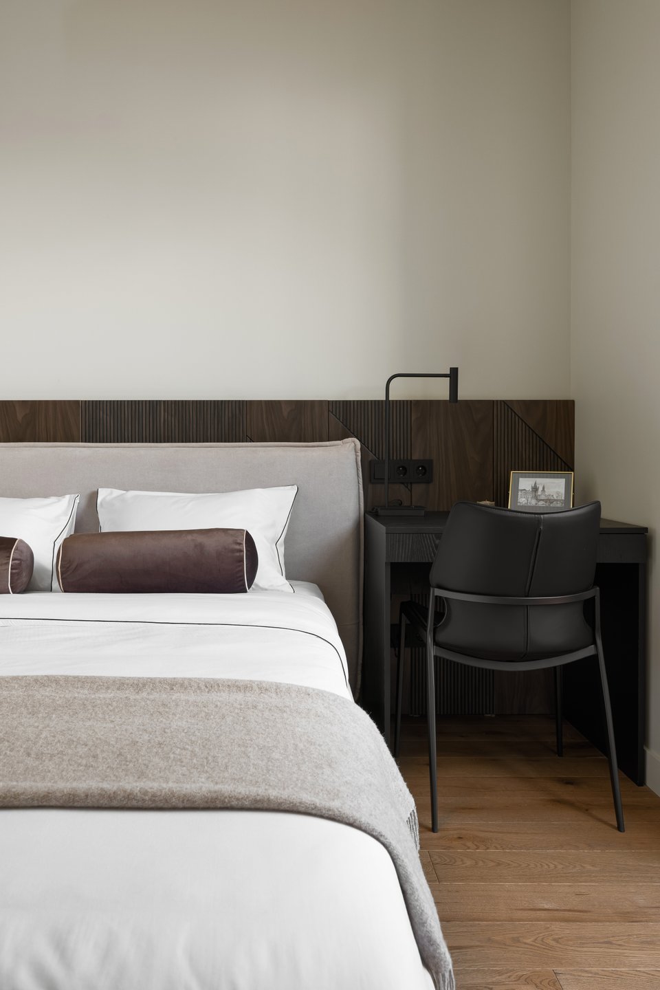 «Ключевым акцентом в спальне стали декоративные стеновые панели с фрезеровкой и черной патиной, — комментируют дизайнеры. — Они добавляют глубину и архитектурность, при этом остаются нейтральным фоном для света и мебели».