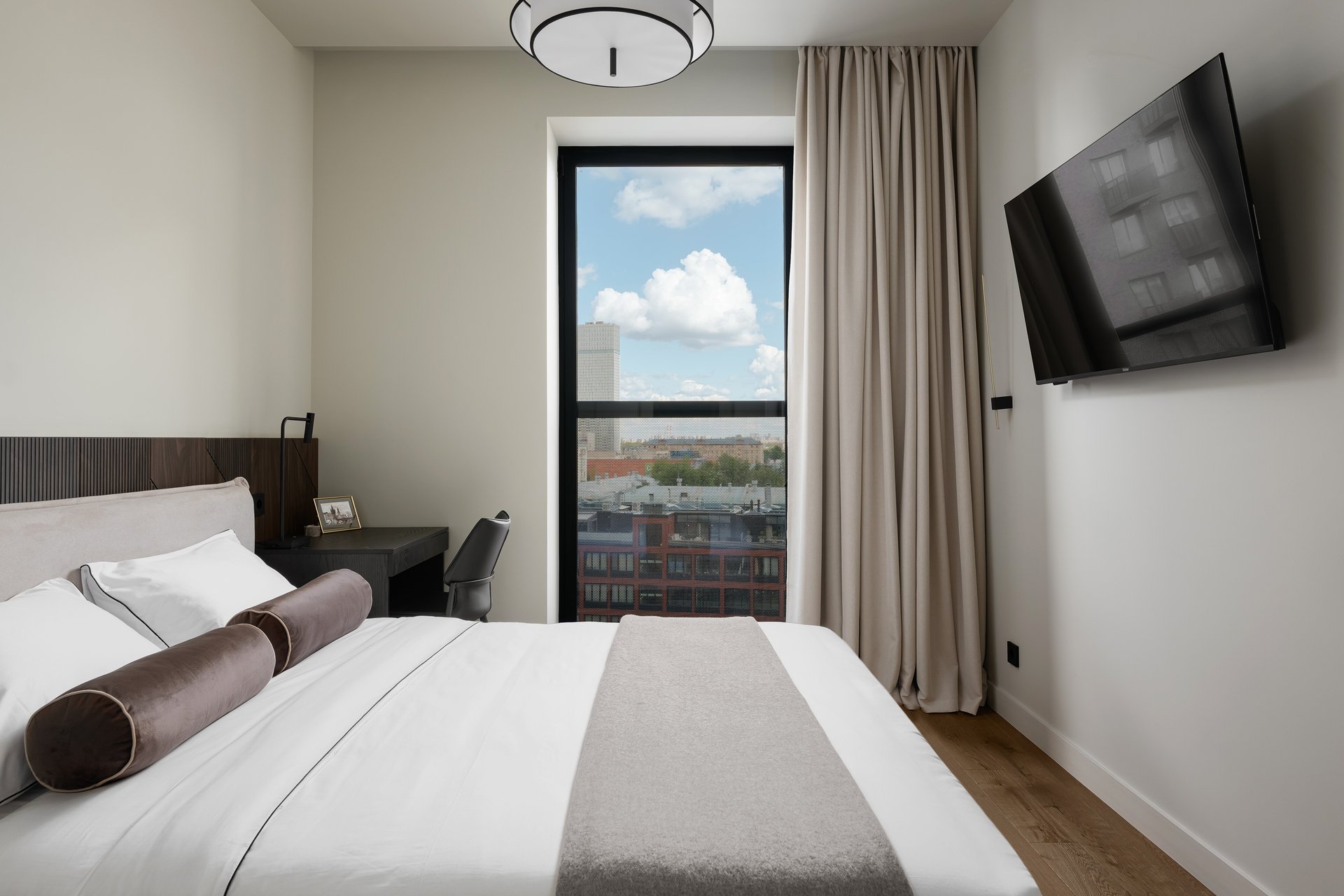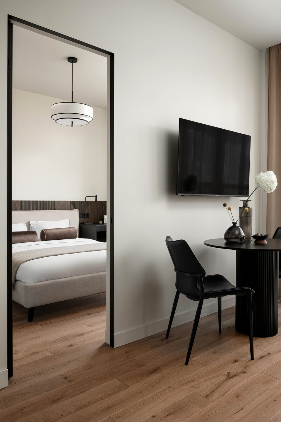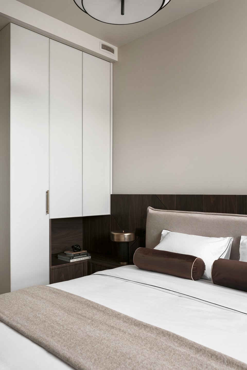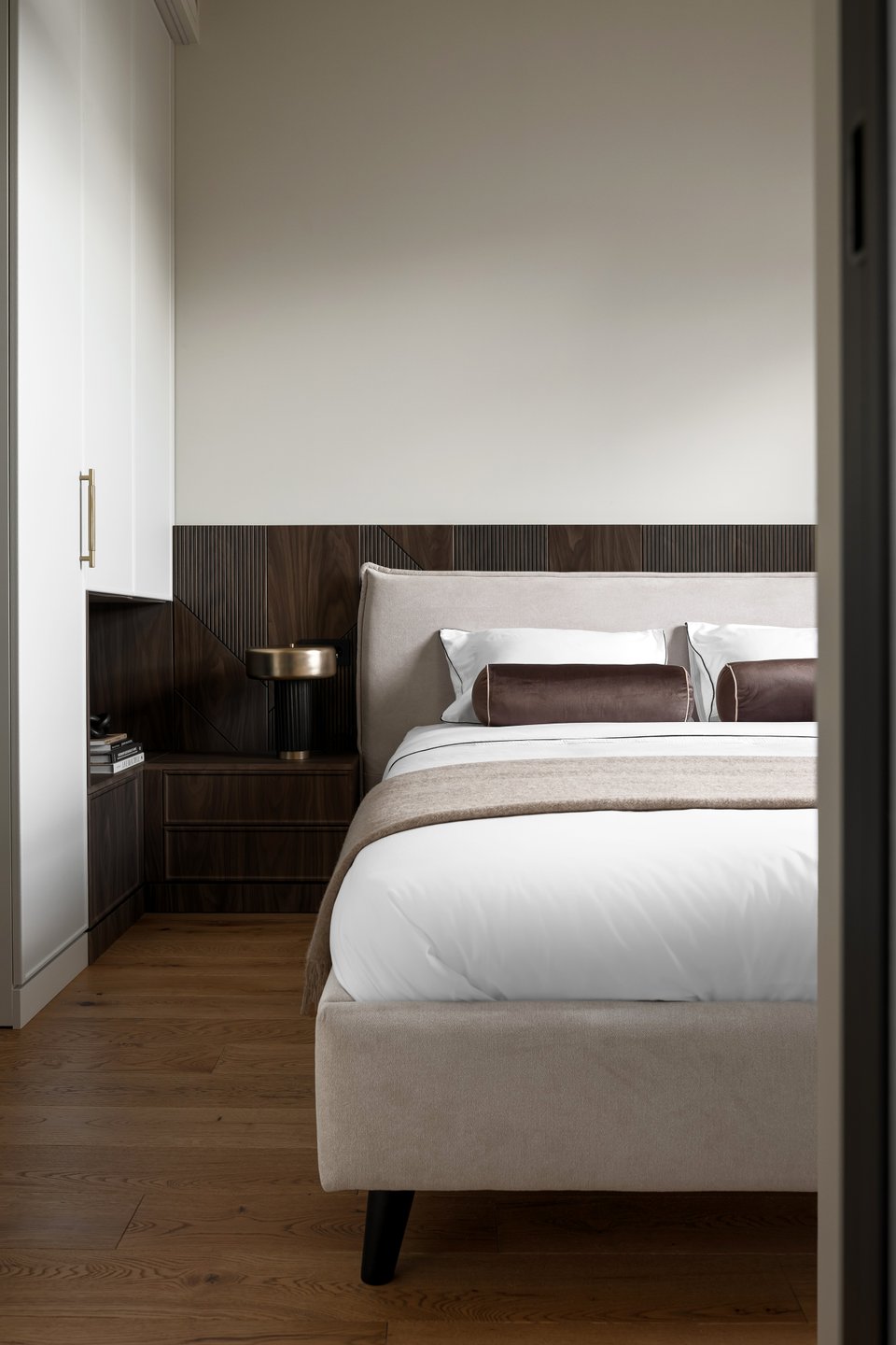 «Ключевым акцентом в спальне стали декоративные стеновые панели с фрезеровкой и черной патиной, — комментируют дизайнеры. — Они добавляют глубину и архитектурность, при этом остаются нейтральным фоном для света и мебели».
