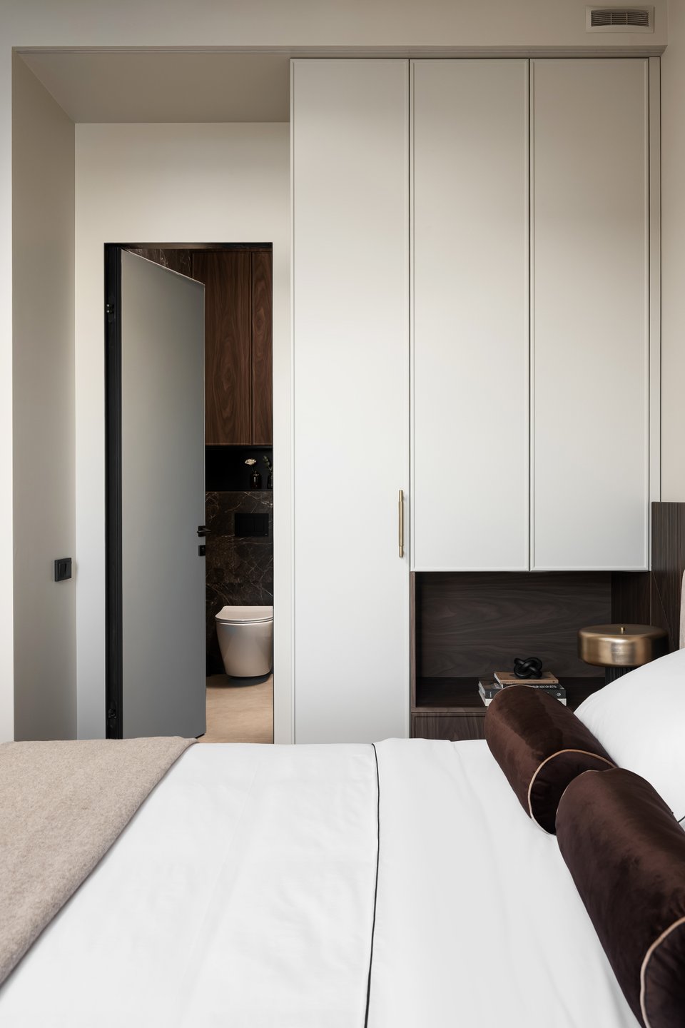 В квартире сделали перепланировку: выделили отдельную спальню и перенесли туда вход в санузел из прихожей (в разрешенных законом пределах — мокрые зоны не трогали и не сдвигали). Это решение дало сразу несколько преимуществ: