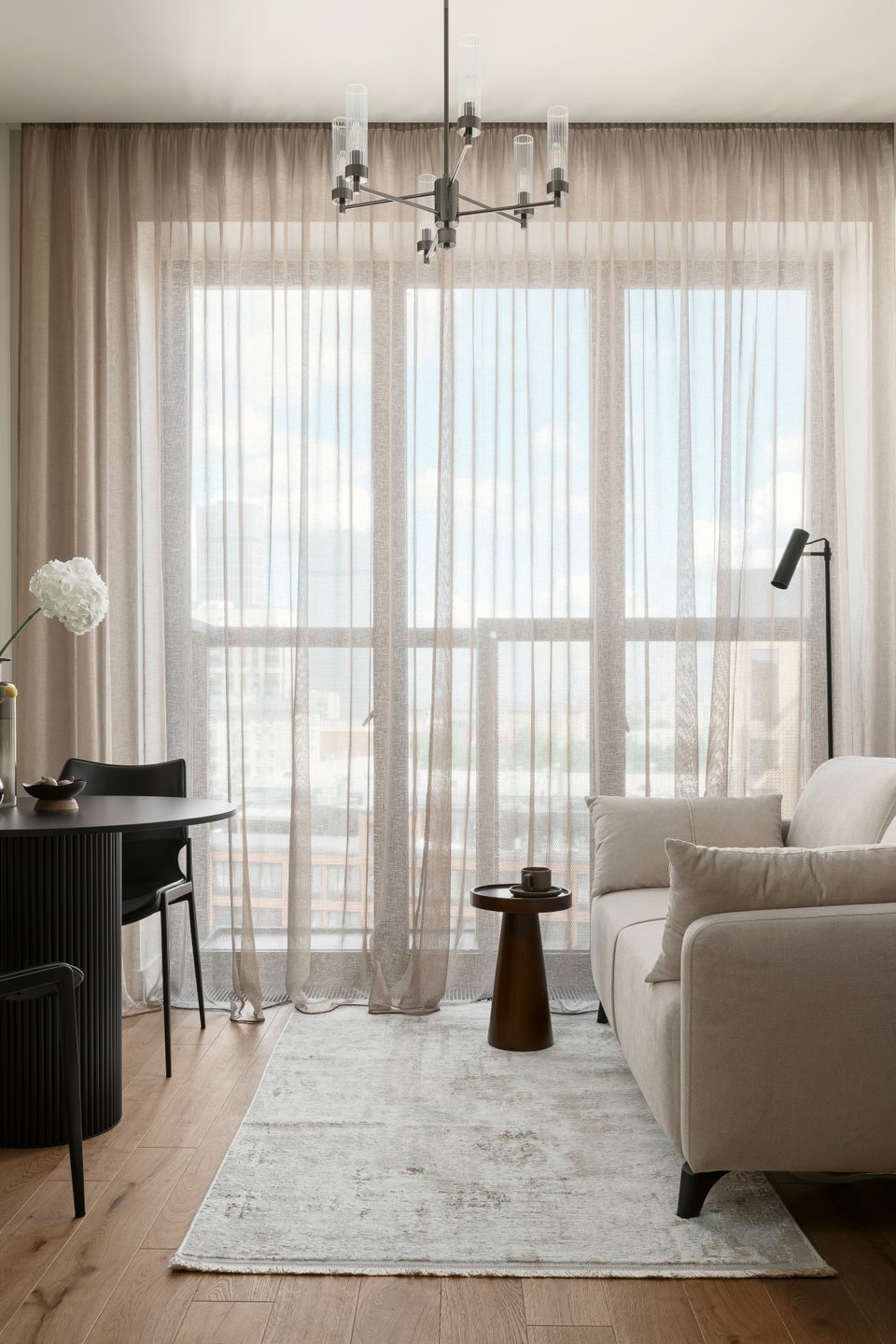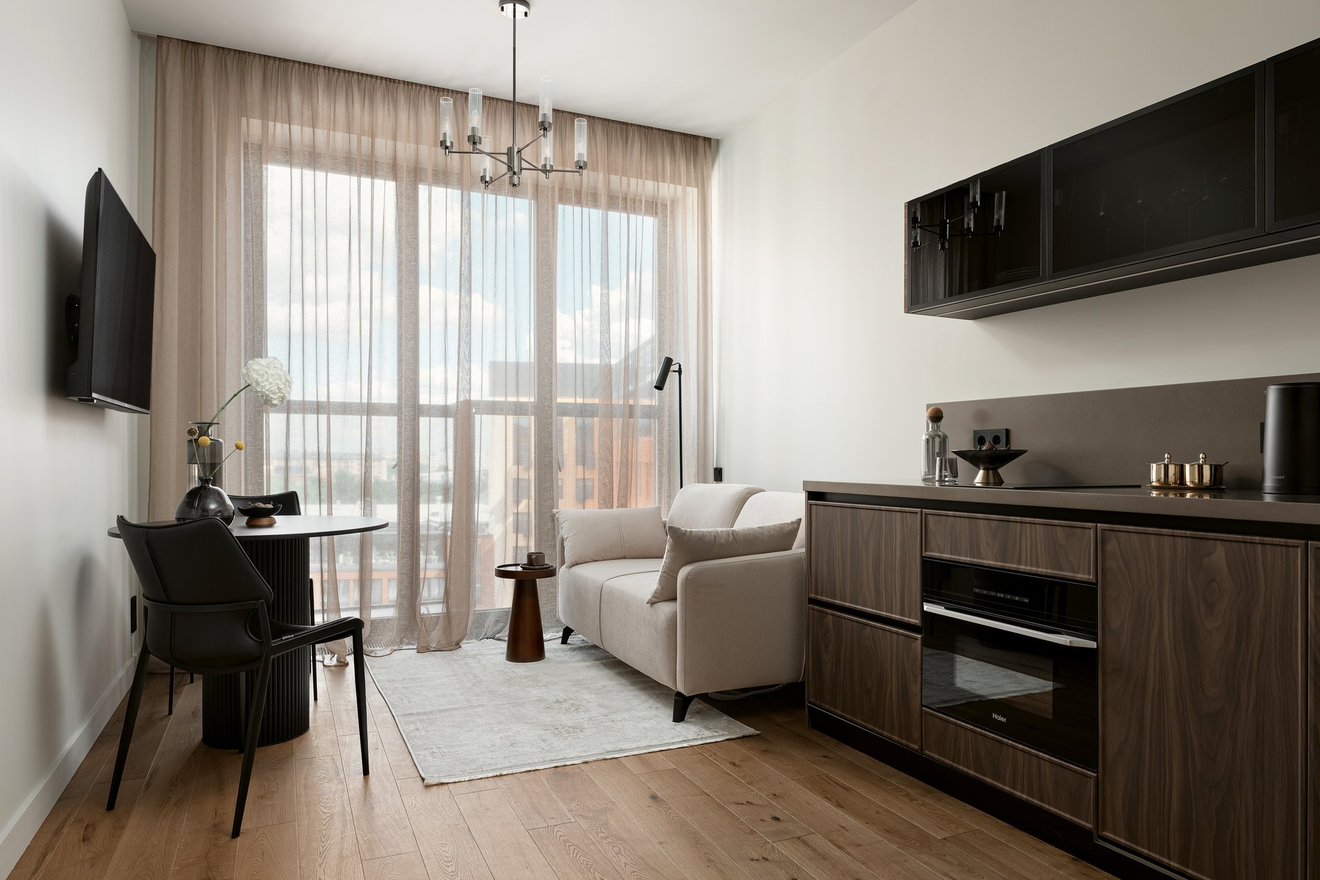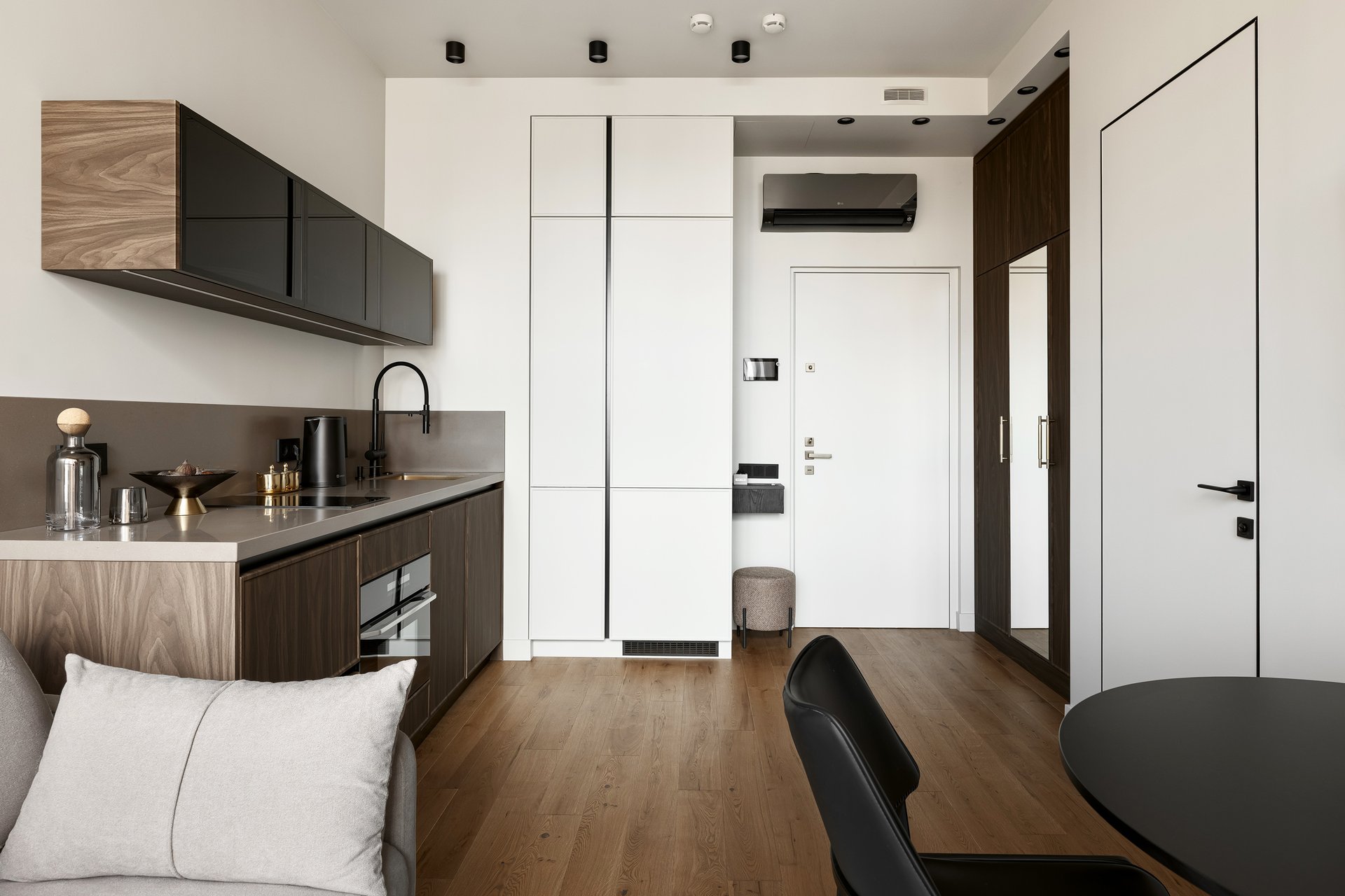 Площадь этой квартиры всего 31 кв.м, но по функционалу она не уступает двушке: здесь есть отдельная спальня с гардеробом, видовая гостиная, полноценная кухня. Посмотрим, как удалось реализовать все пожелания заказчика.