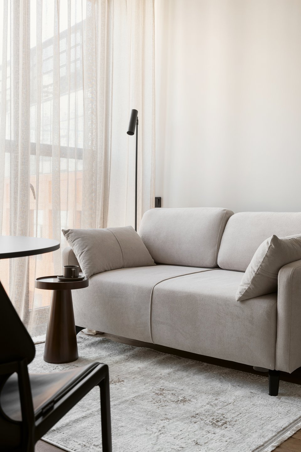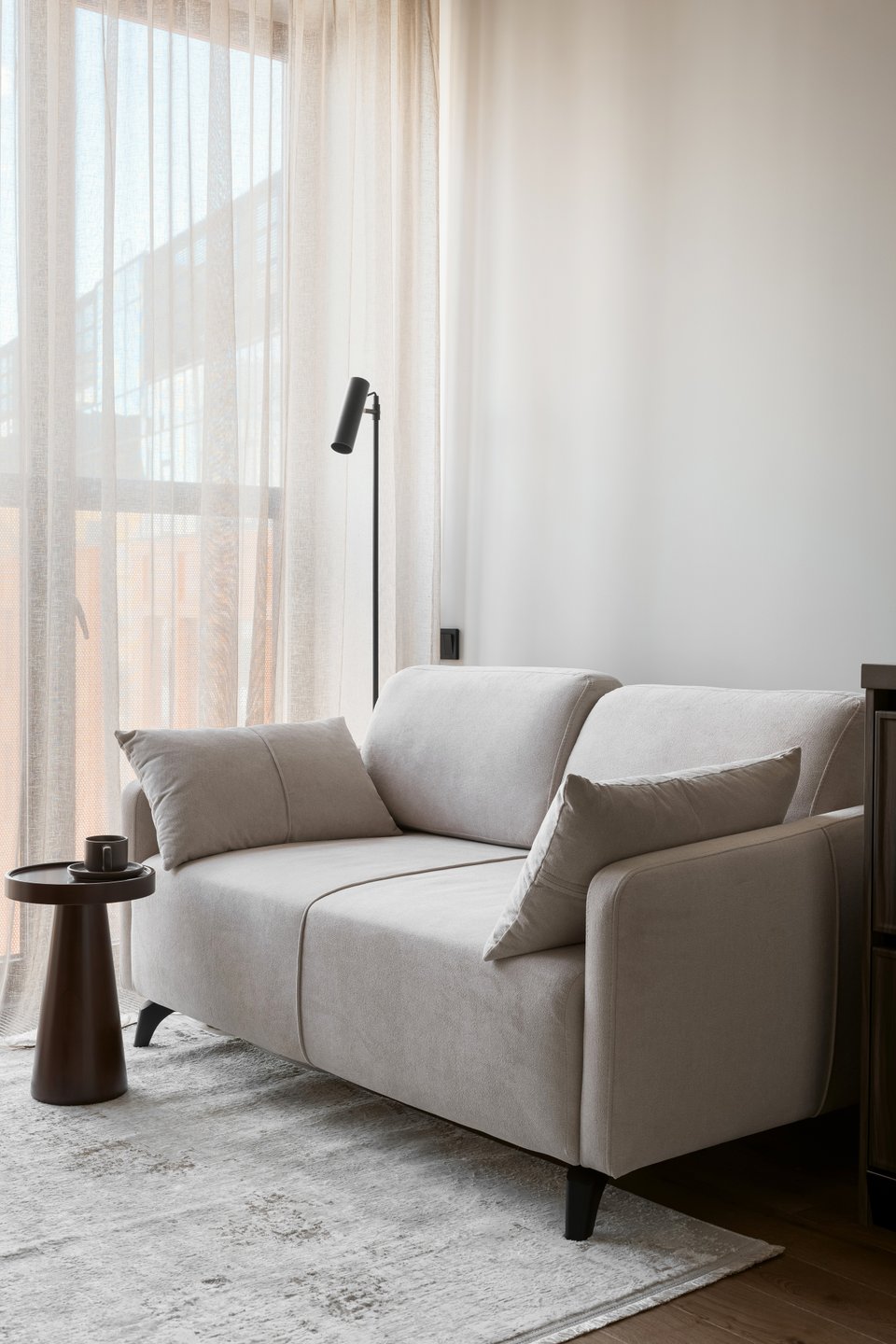 Диван Льери Мини в зоне гостиной — от divan.ru. Модель выбрали за редкий формат: ширину около 160 см, лаконичную форму и аккуратную геометрию, которая не дробит интерьер. Журнальный стол Джейми — идеальный компаньон к нему по форме и цвету.