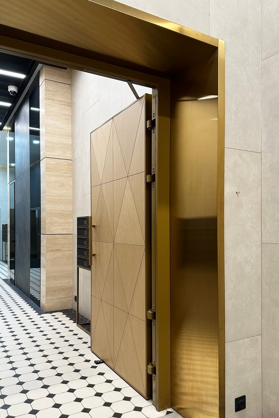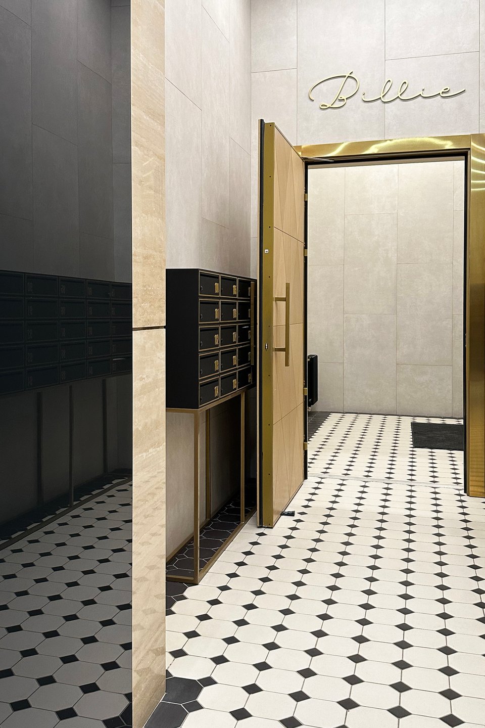 Идея проекта связана с оформлением лобби дома, в котором расположена квартира. Цветовая палитра: орех, кварцево-серый, черный и бежевый.