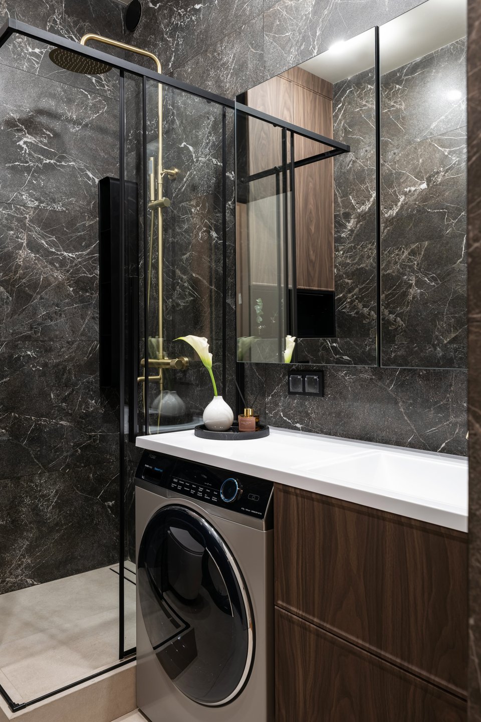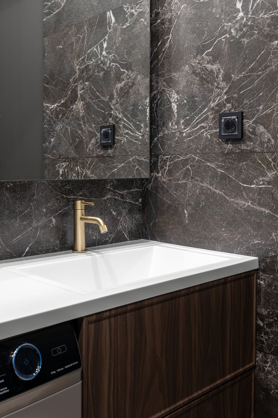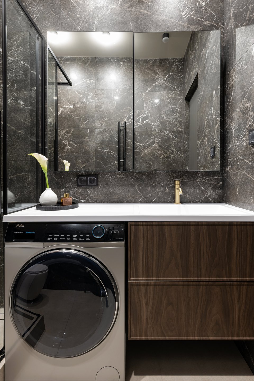 Зону раковины и стиральную машину поменяли местами по сравнению с исходным вариантом, чтобы улучшить эргономику и упростить доступ к технике. Тумба и шкаф с зеркалом изготовлены на заказ. За зеркалом скрывается сантехнический лючок и хранение.