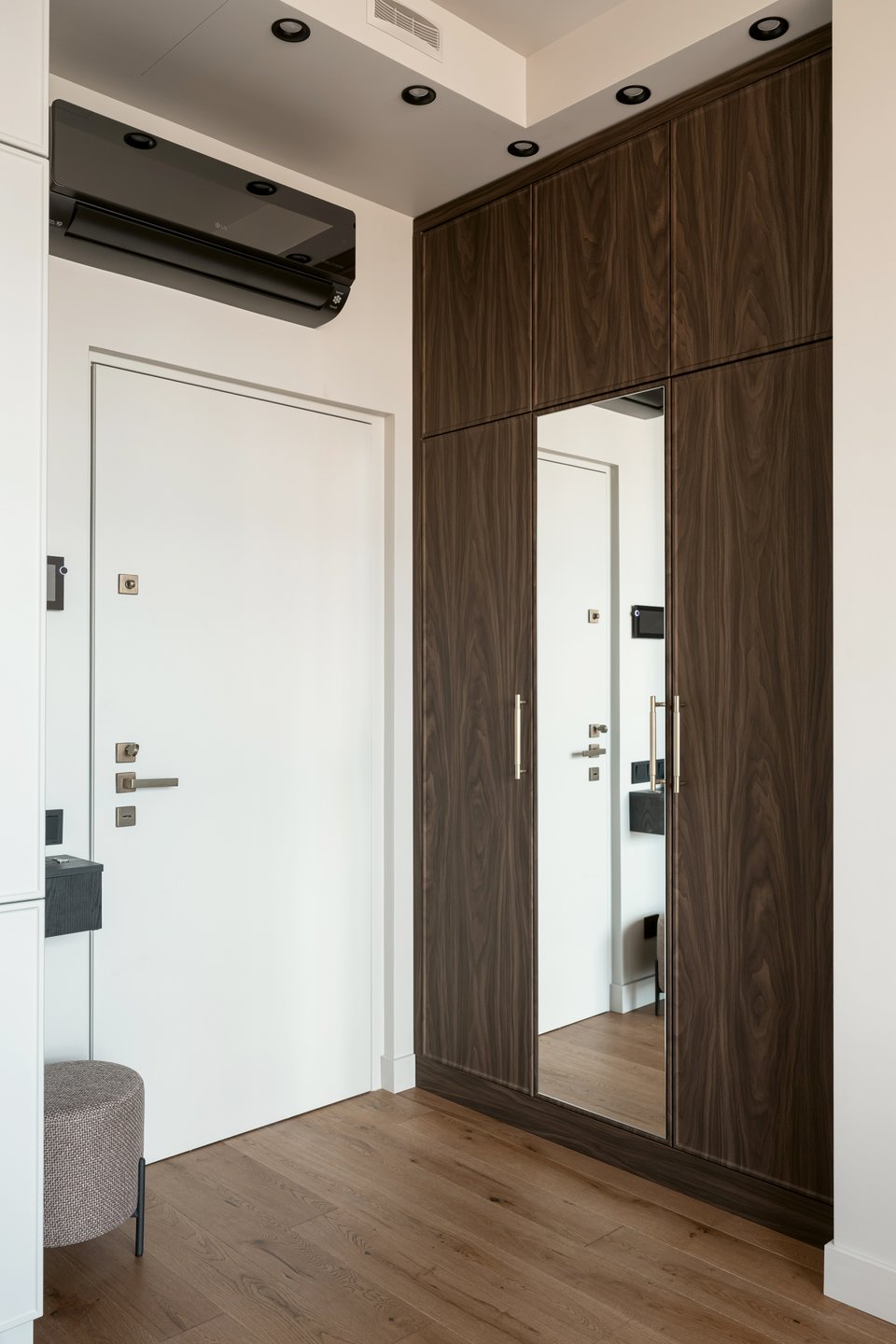 Отделка прихожей такая же, как в основном пространстве квартиры — чтобы входная зона не выглядела обособленной. Система хранения полностью встроенная. Внутри скрыты электрощиток и коллектор. Помимо этого, в шкафу предусмотрен отдельный хозяйственный блок, где может храниться все необходимое для быта: пылесос (с отдельной розеткой), стремянка, гладильная доска, утюг и прочий инвентарь.