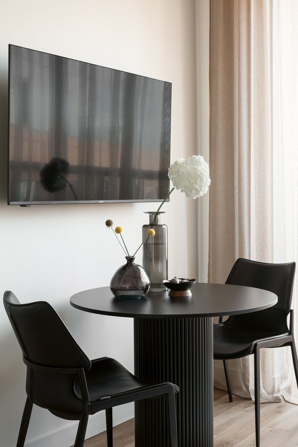 Стены и потолок во всей квартире окрашены в один цвет. На полу инженерная доска, а вместо обычных радиаторов — внутрипольные конвекторы: стены остаются «чистыми» и ничем не перегруженными.