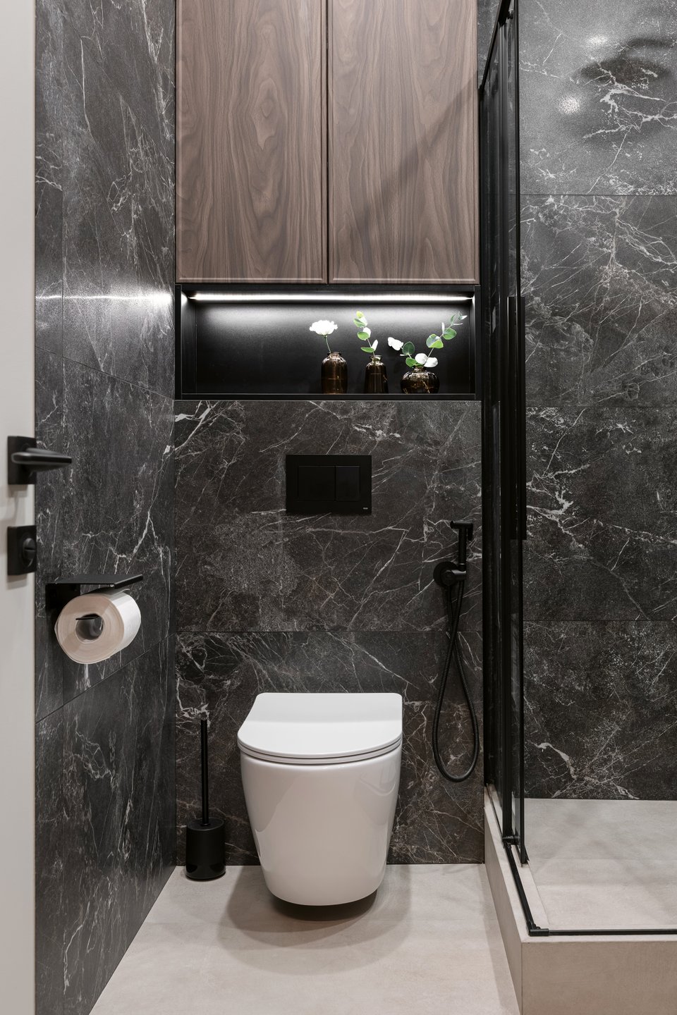 «Ключевой акцент в санузле — душевая стойка с термостатом, — рассказывают авторы проекта. — Это редкое решение для небольших квартир, но оно существенно повышает комфорт в ежедневном использовании и визуально добавляет интерьеру статусности без перегруза».