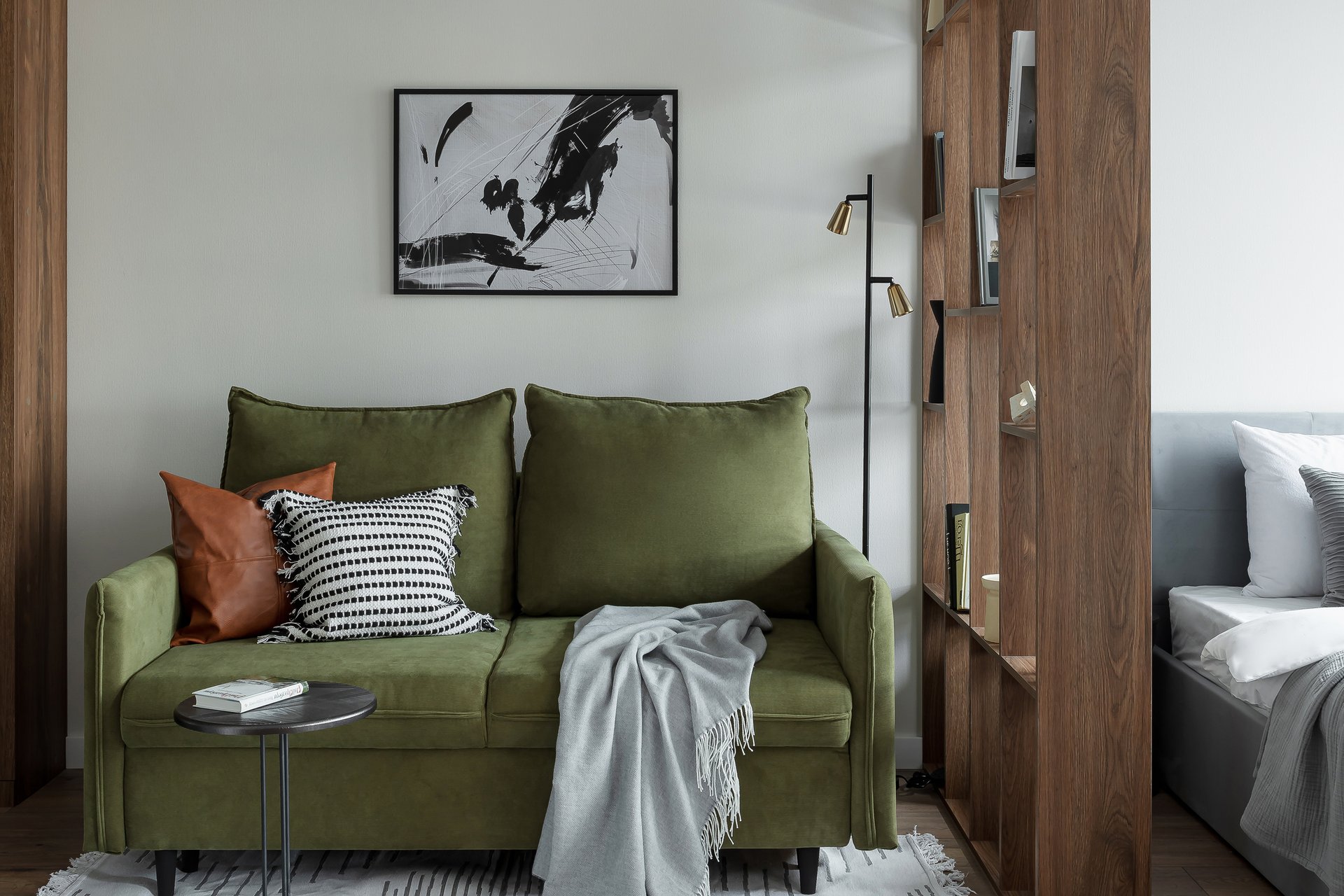 Диван Слипсон Мини от divan.ru в обивке оливкового цвета подошел по цвету к темному дереву и вписался по габаритам. Несмотря на компактный размер (длина модели всего 157 см), диван раскладывается в комфортное спальное место шириной 139 см. Кстати, сидеть и лежать на нем очень комфортно.
