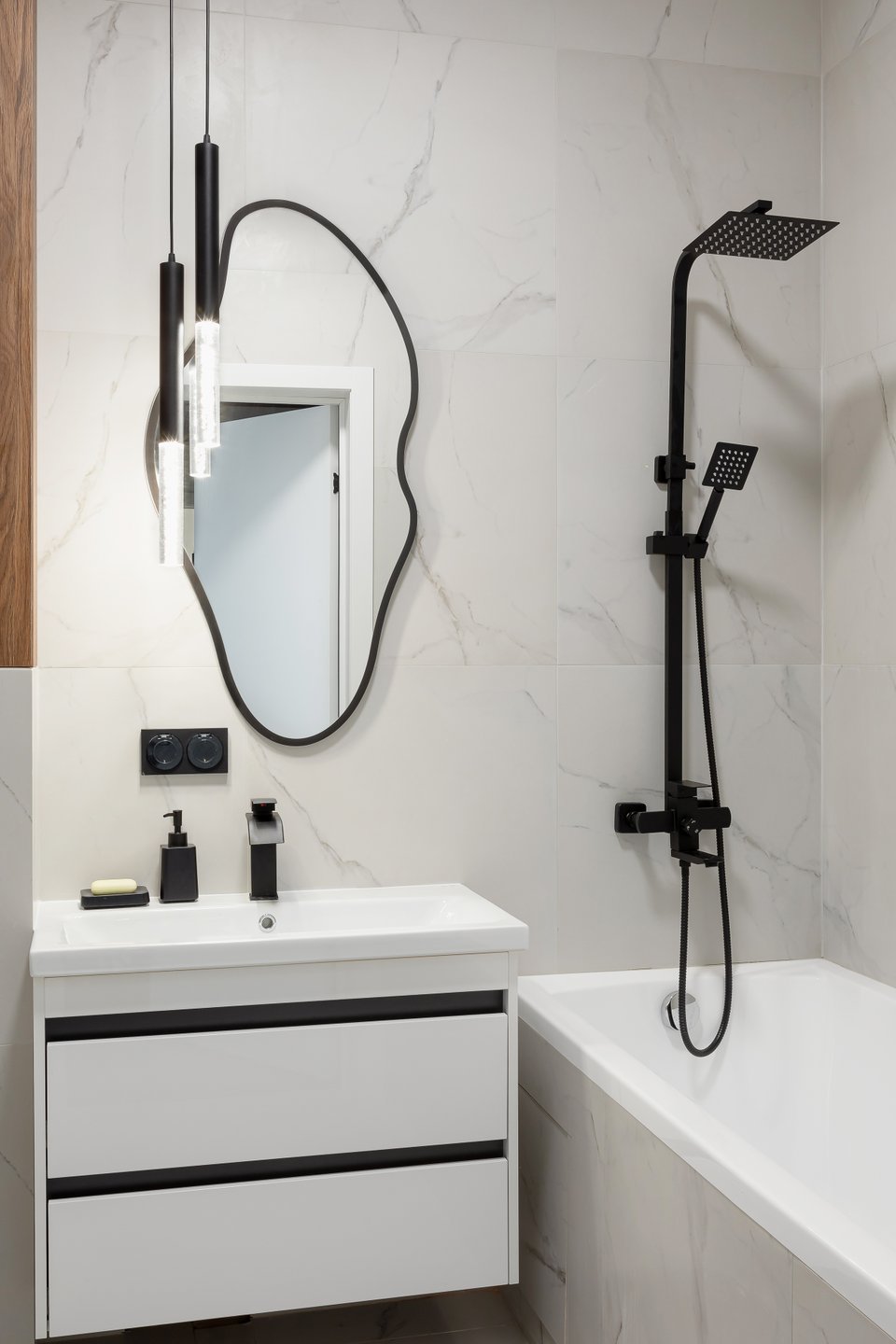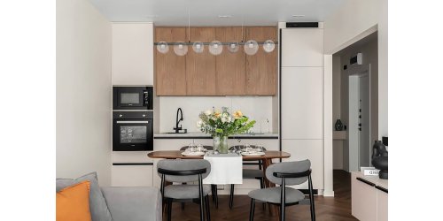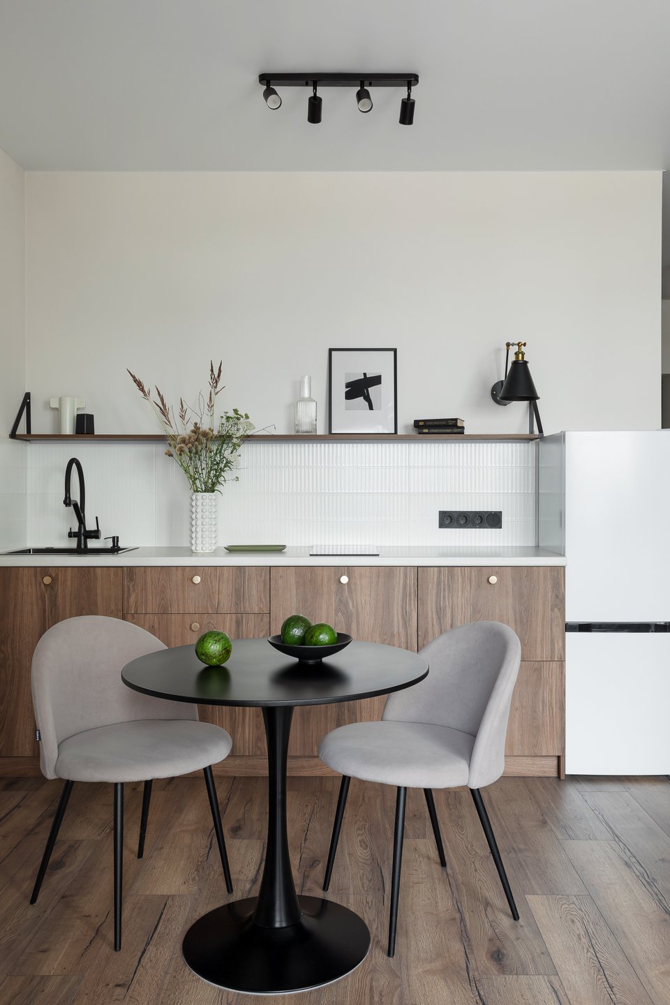 Стены в квартире оклеили обоями и покрасили, на пол уложили ламинат. Кухонный фартук облицевали рельефной белой плиткой. Динамики в интерьер добавили элементы черного цвета: круглый обеденный стол и ножки стульев, электрика, светильники, декор.