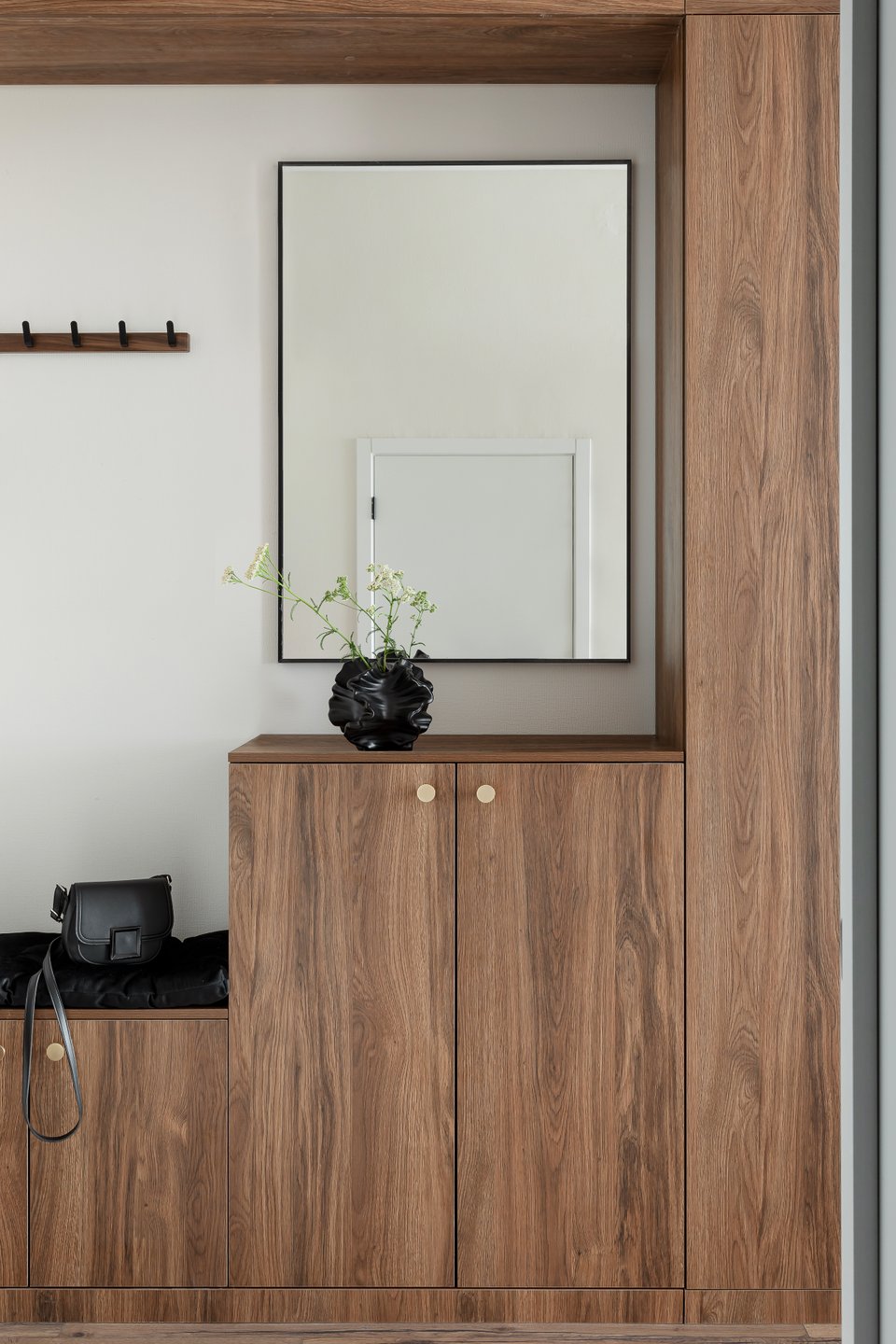 Систему шкафов разной высоты во входной зоне изготовили на заказ. Обстановку дополнили настенным зеркалом и крючками для сумок и верхней одежды.