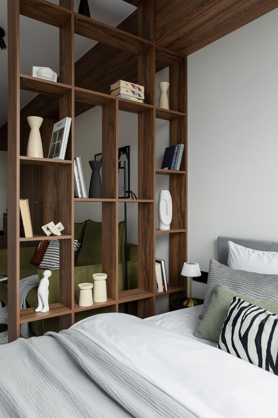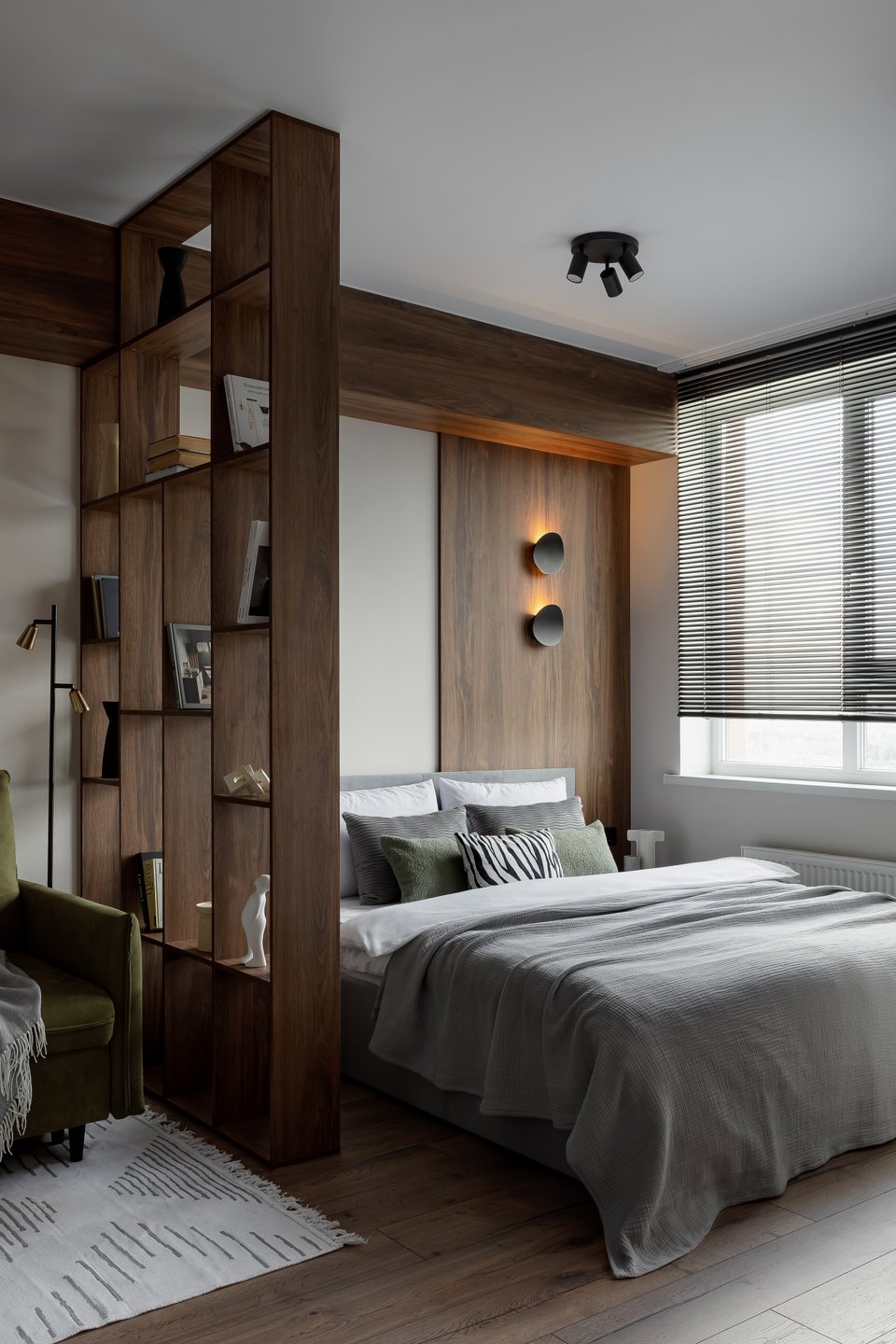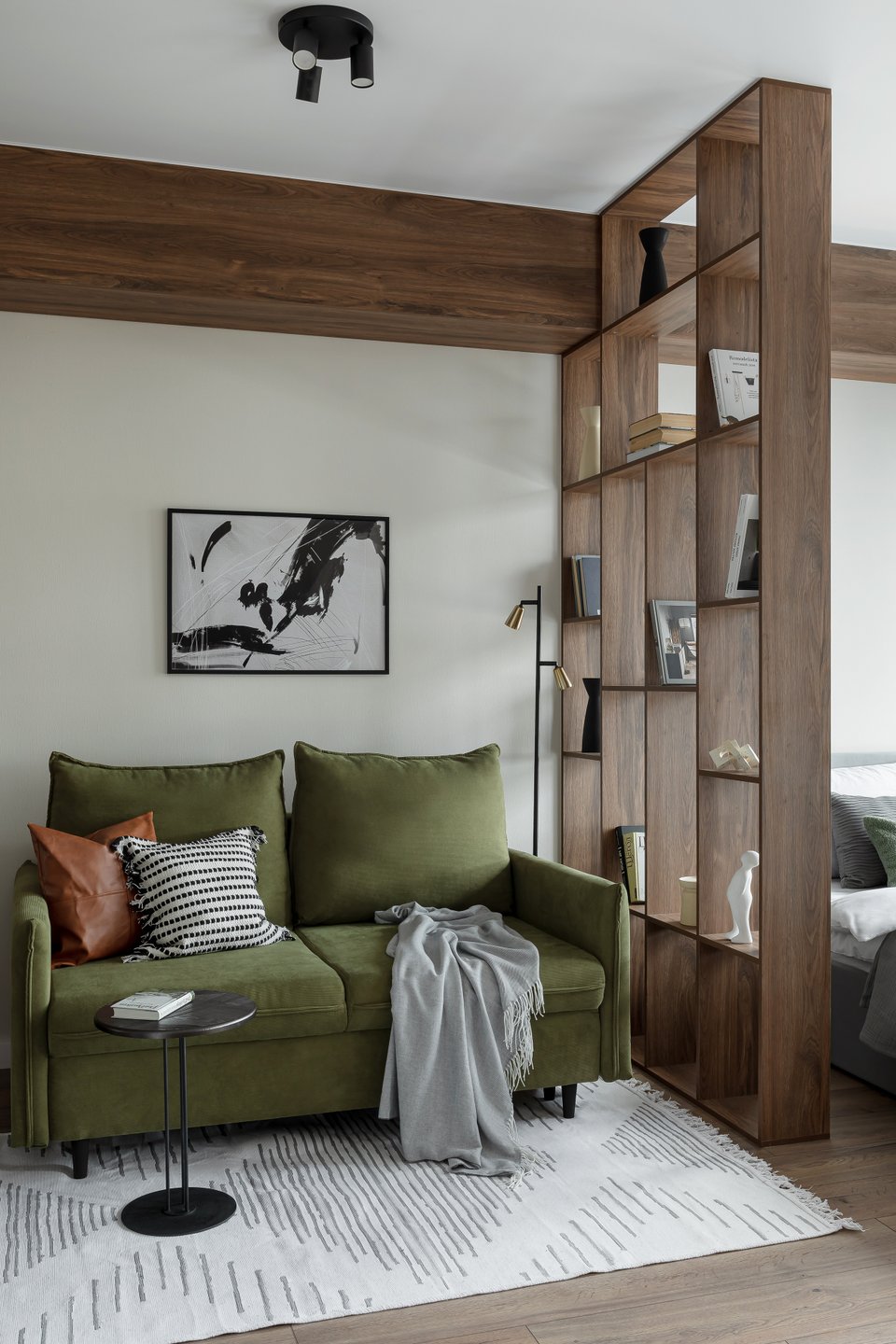 Фишкой этой квартиры стала перегородка с книгами, которая делит пространство на зоны спальни и гостиной.