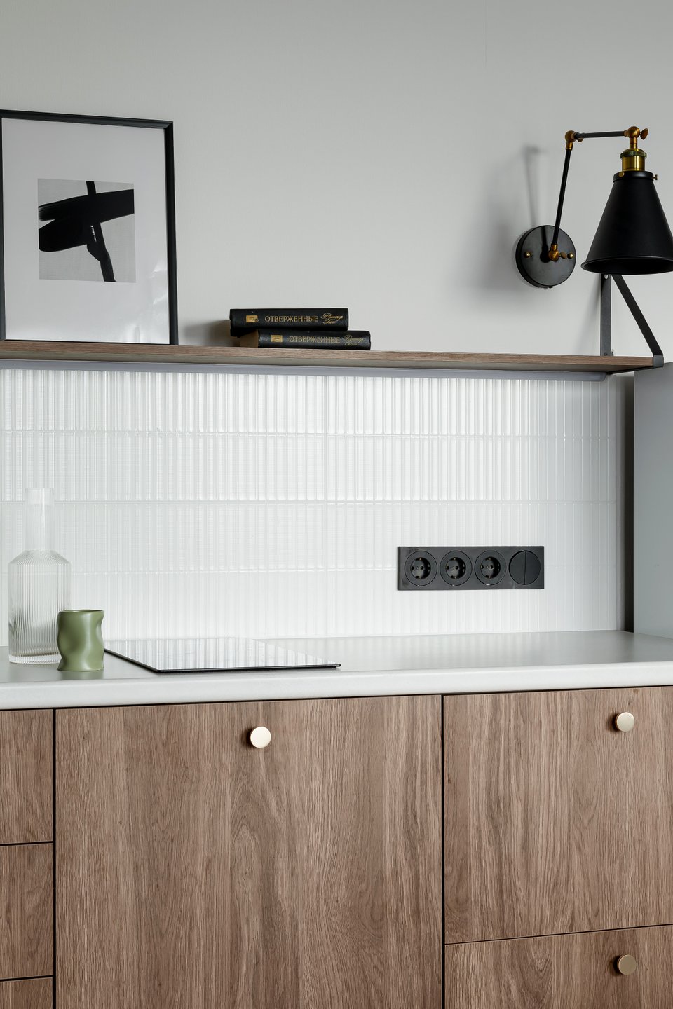 На чем сэкономили: гарнитур не стали комплектовать верхним ярусом, а также духовым шкафом и вытяжкой. Установили лишь варочную поверхность, холодильник и СВЧ-печь — этого достаточно для посуточной аренды.