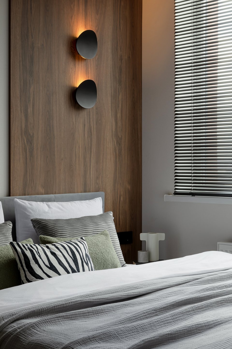 Спальную зону обустроили у окна. Часть стены за изголовьем декорировали тем же ЛДСП цвета темного дерева и повесили пару бра для вечернего освещения. С обеих сторон от кровати установили прикроватные столики Тони от divan.ru. На окне — лаконичные жалюзи. На балконе организовали рабочее место.