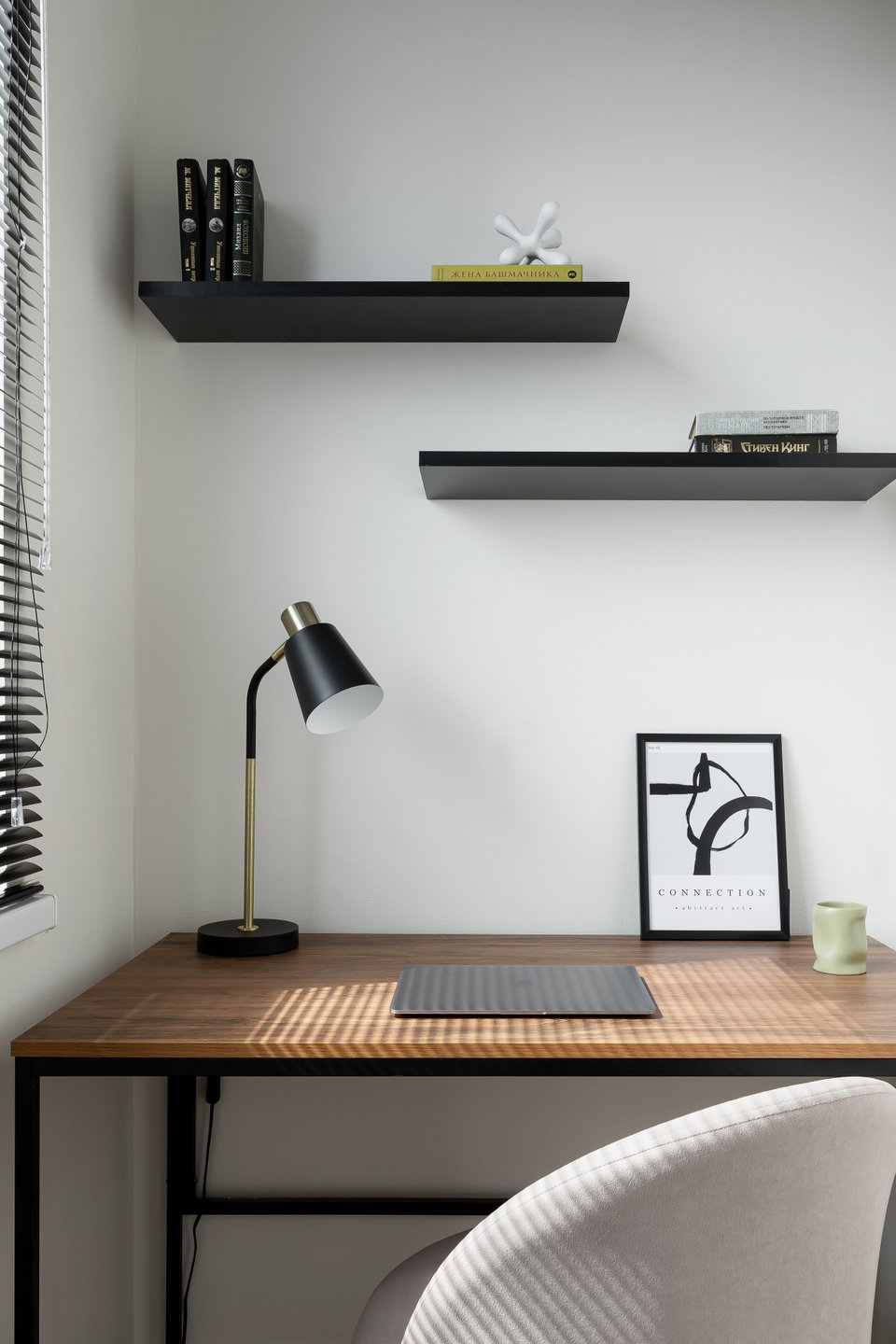 «Особенность планировки — выступ по потолку вдоль одной из стен, который нельзя убрать, так как там проходят важные коммуникации, — комментирует хоумстейджер. — Застройщик оказался предусмотрительным: в экспликации эта “архитектурная изюминка” присутствует. Поэтому площадь осталась прежней, просто в комплекте к квартире получили встроенный “декор”. Перепланировку не делали, пространство зонировали с помощью перегородки-стеллажа».