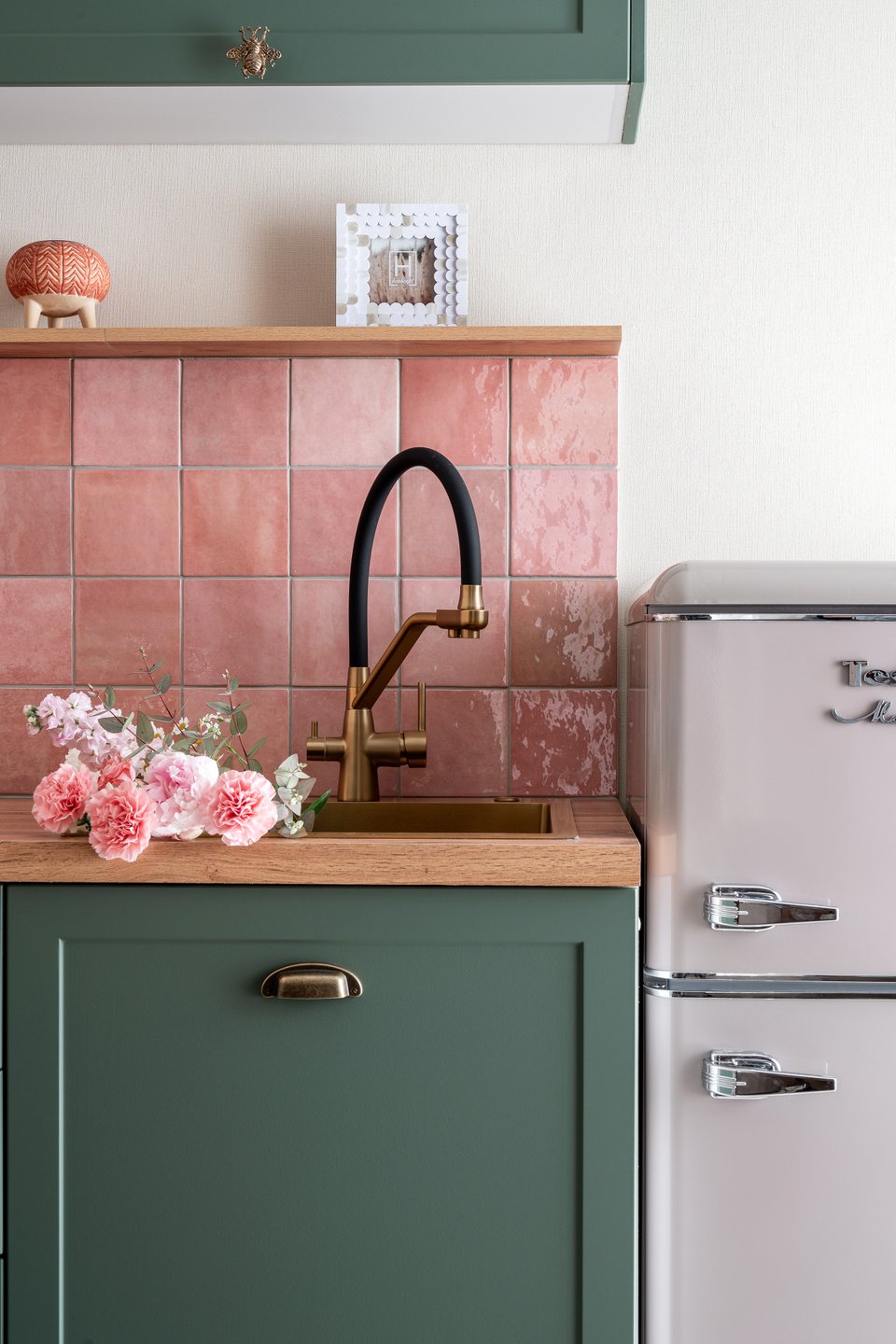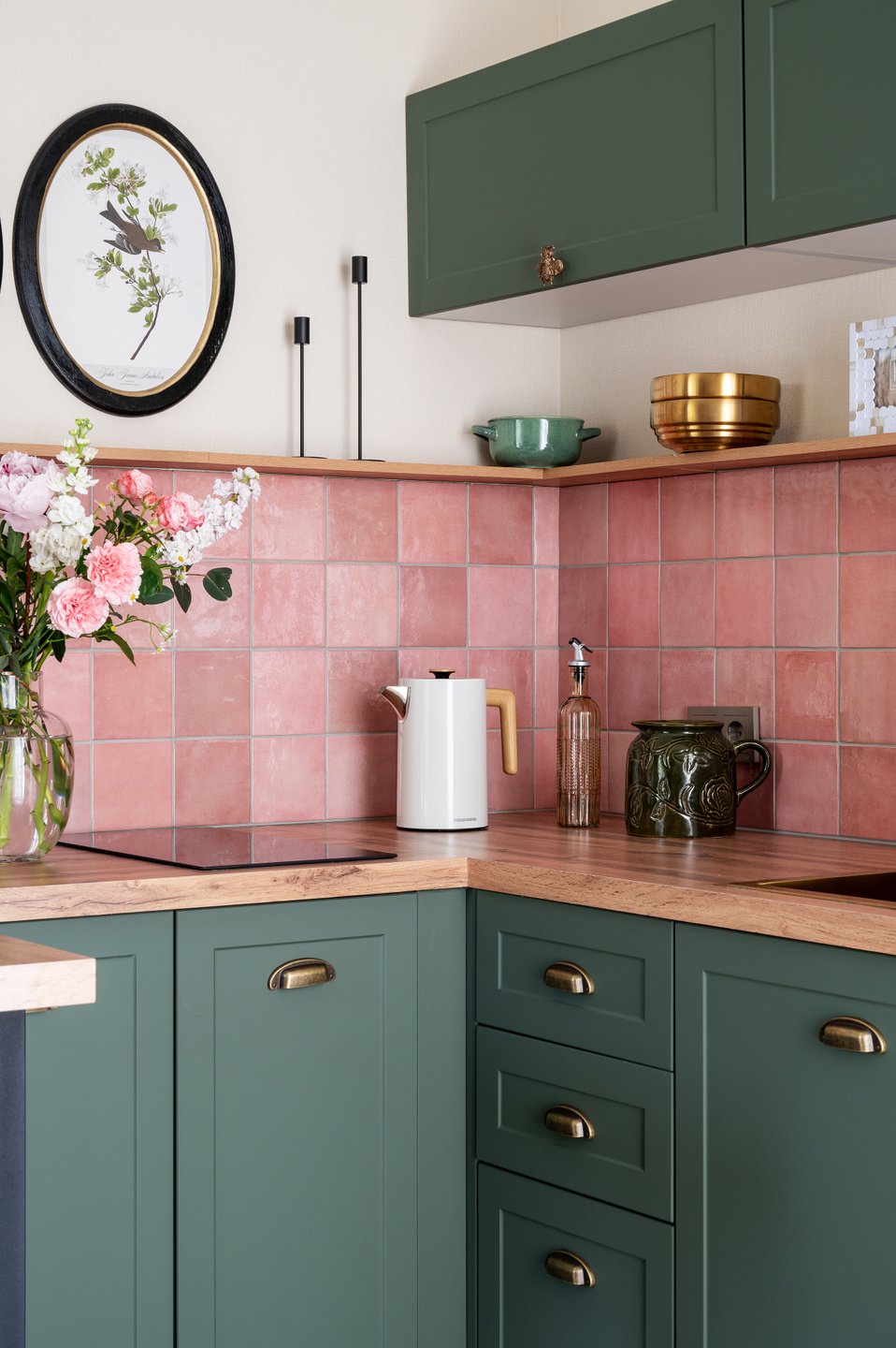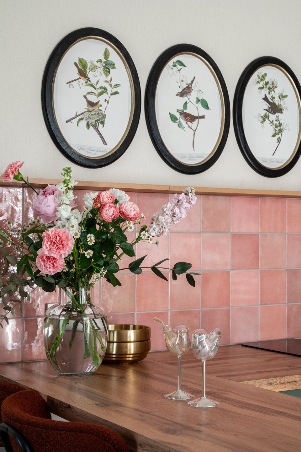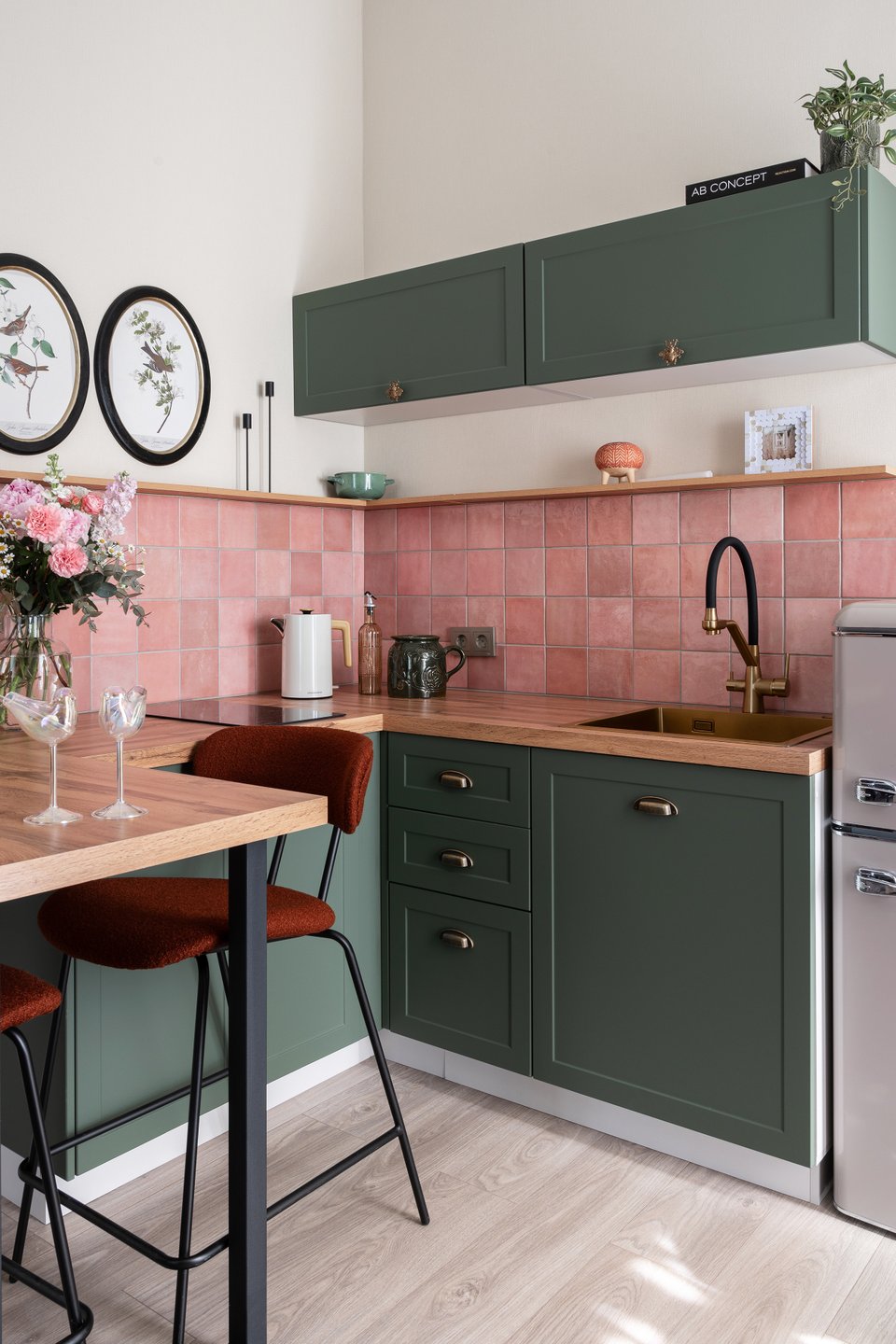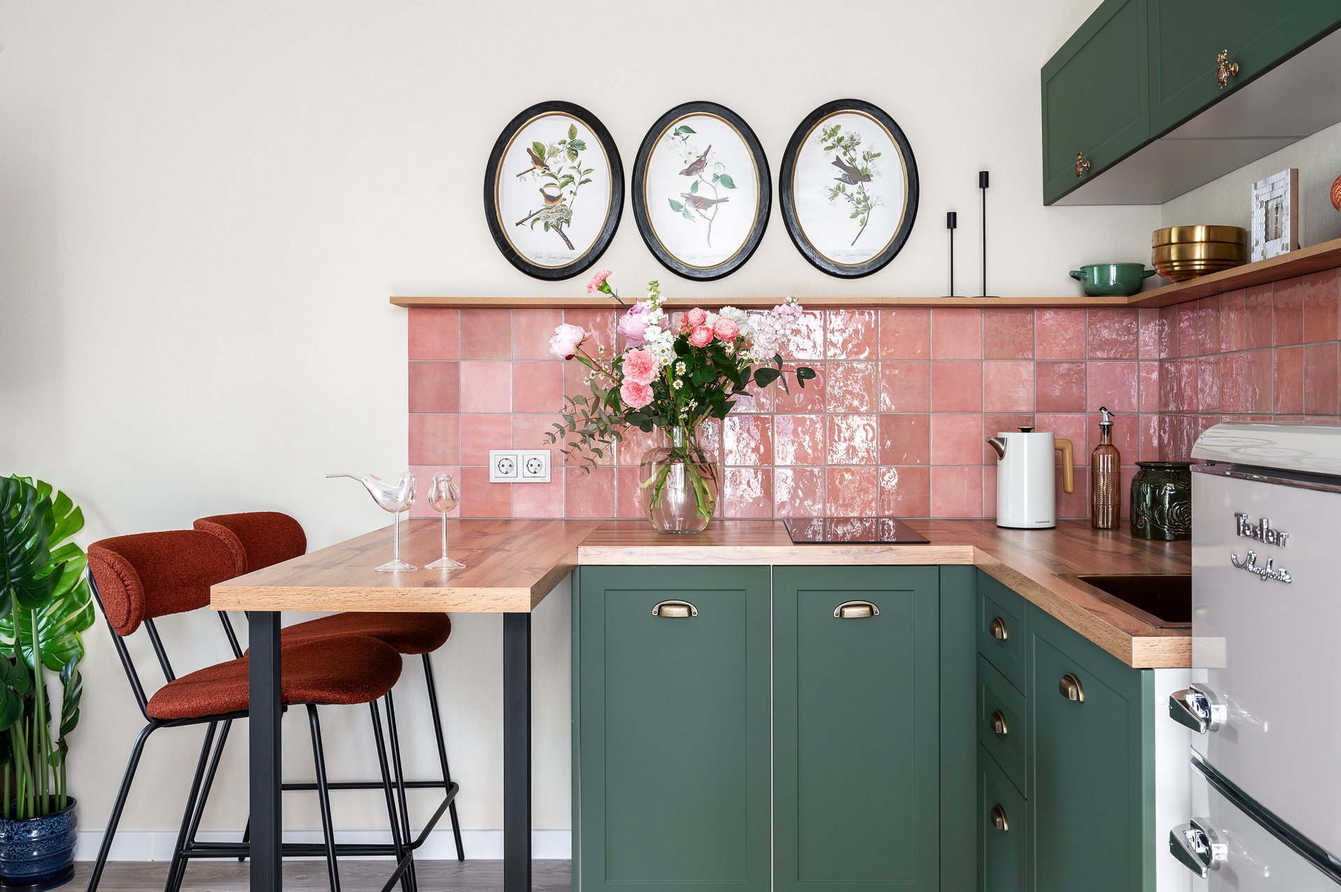 В зоне кухни преобладает настроение ретро. Готовый угловой гарнитур с маркетплейса преобразили с помощью необычной фурнитуры (ручки бронзового цвета) и деревянной столешницы, изготовленной на заказ. Нестандартно узкие верхние шкафы повесили только по одной стене, под ними закрепили открытую полку. Фартук выложили рельефной плиткой в винтажном стиле. Гарнитур «завершили» небольшим холодильником с одной стороны и барной стойкой с другой. Стену над последней украсили тремя постерами в овальных рамах.