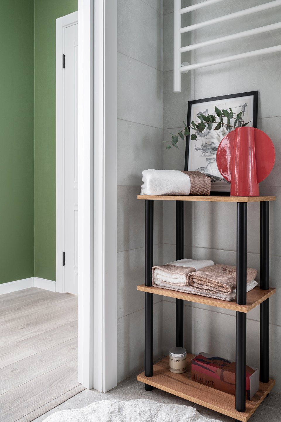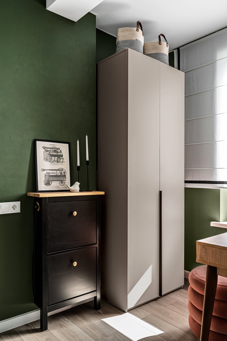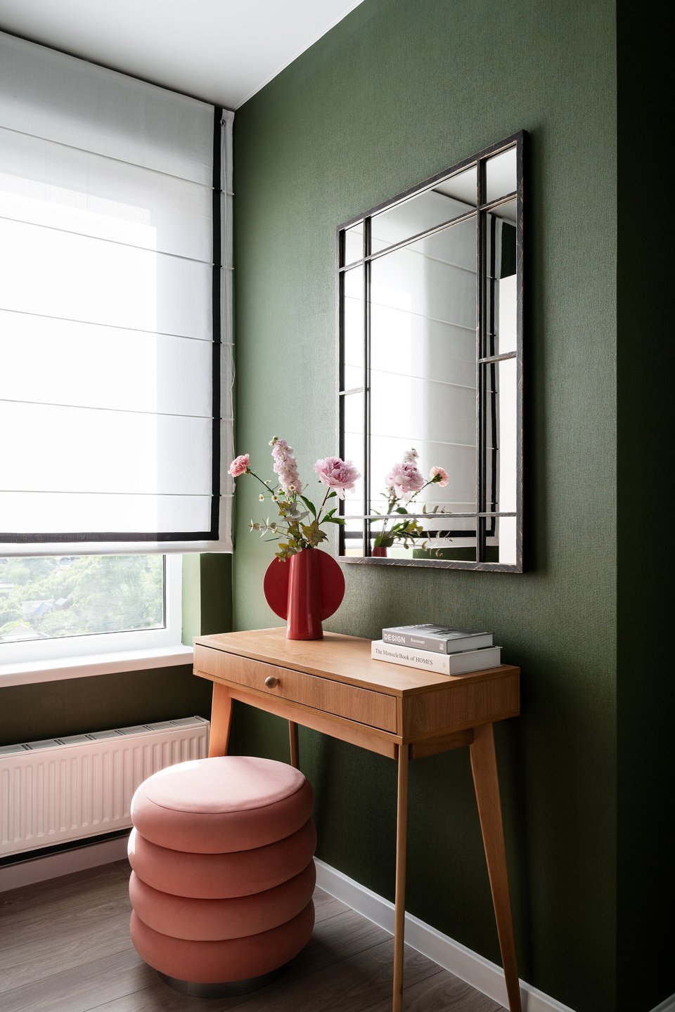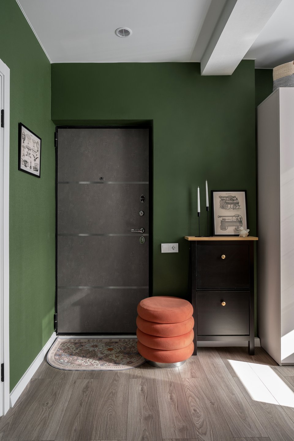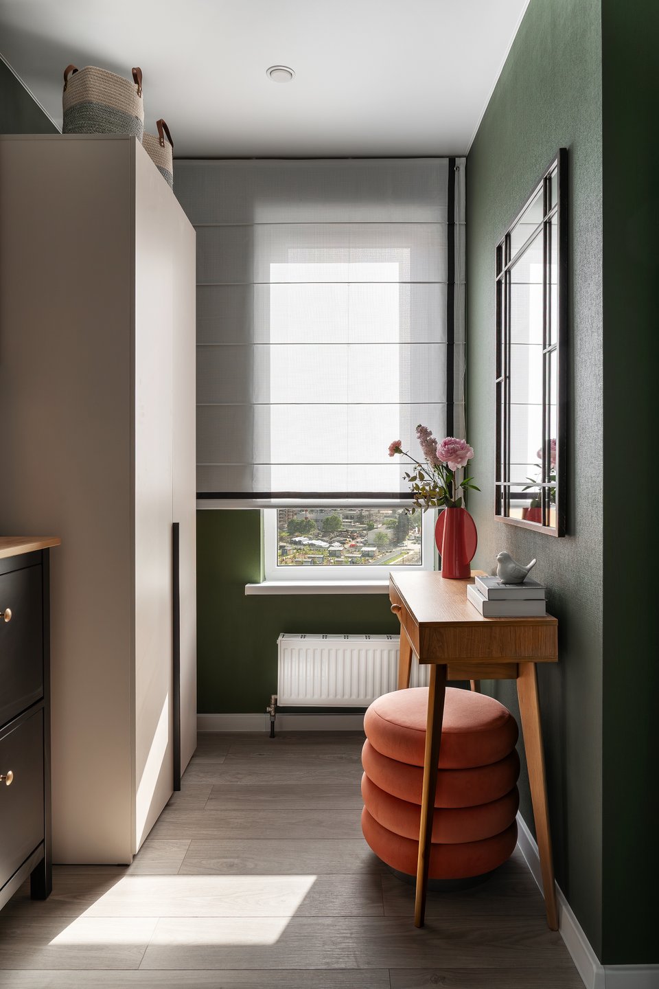 Природный оттенок зеленого, использованный в комнате в качестве акцента, в прихожей выступает фоновым. Особенность прихожей — наличие окна. Возле него поставили туалетный столик с удобным пуфом. Для хранения здесь есть шкаф и обувница.