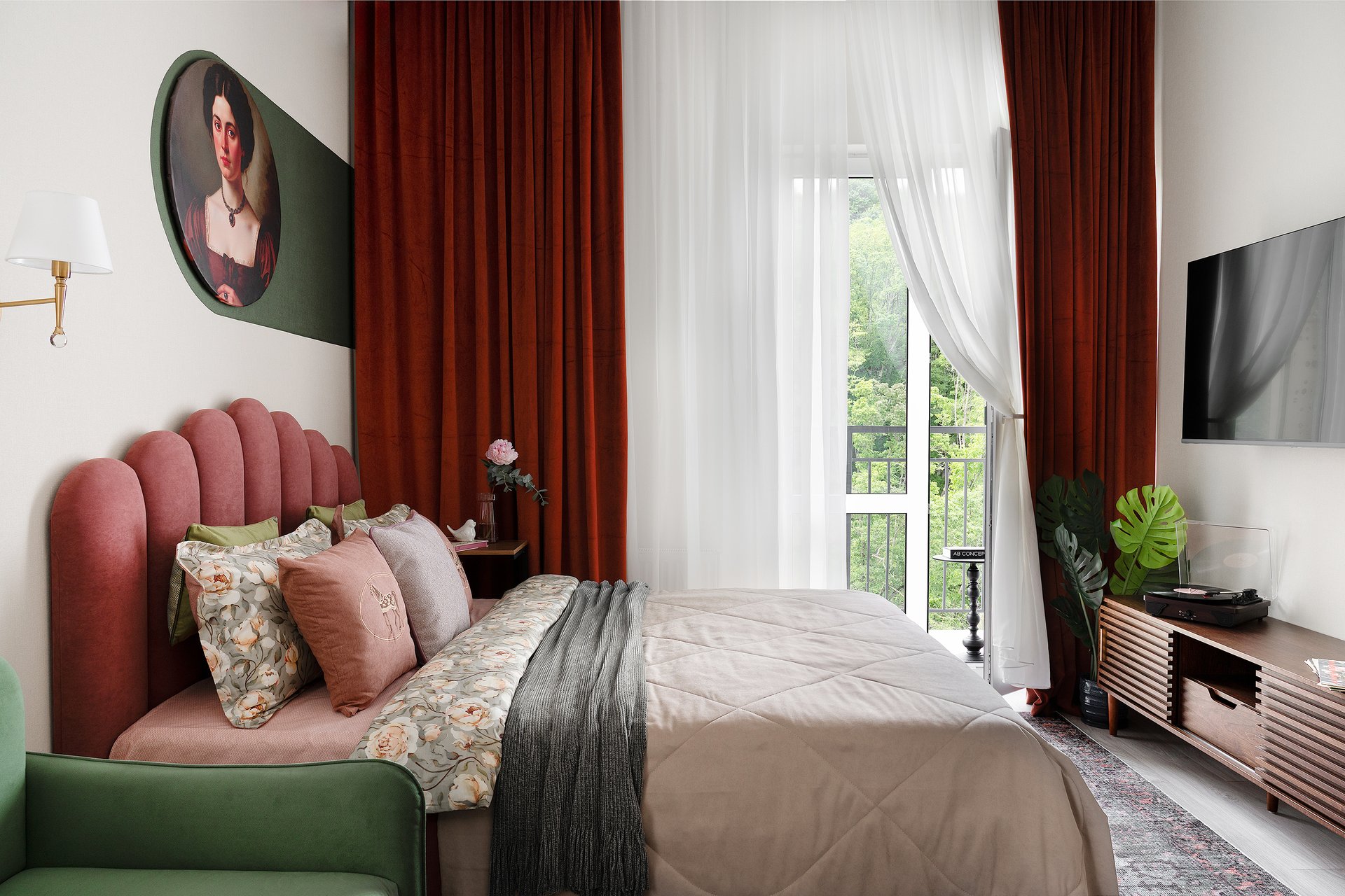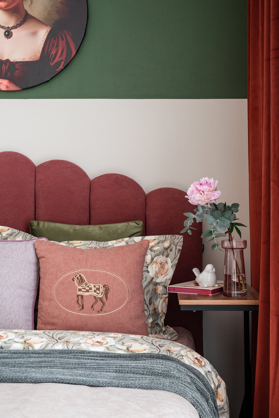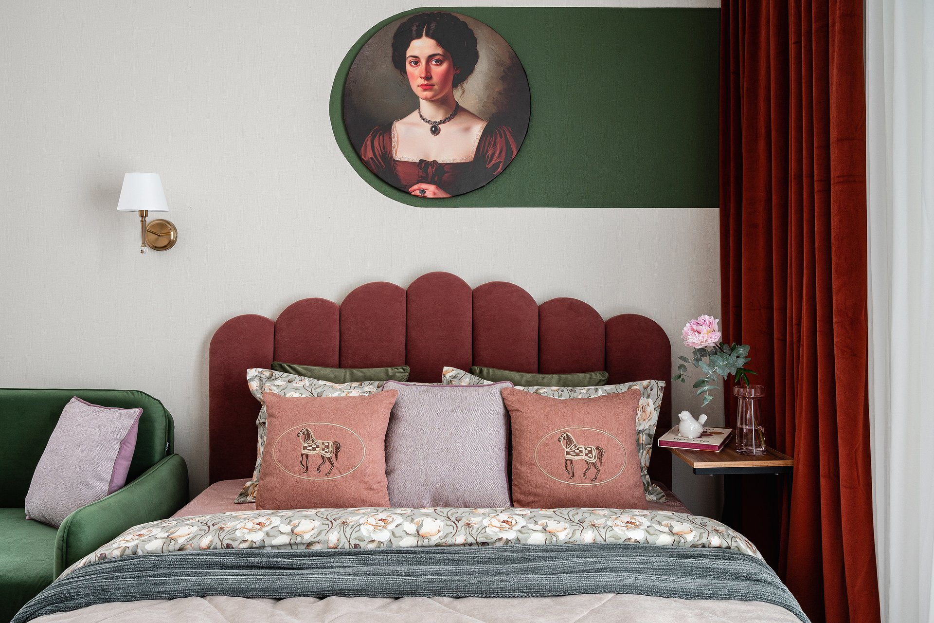 «Концепция оформления спальной зоны началась с портрета на стене, — рассказывает дизайнер. — Я создала его с помощью ИИ, распечатала и натянула на холст. Портрет стал акцентом, задающим интерьеру настроение ностальгии и театральности».