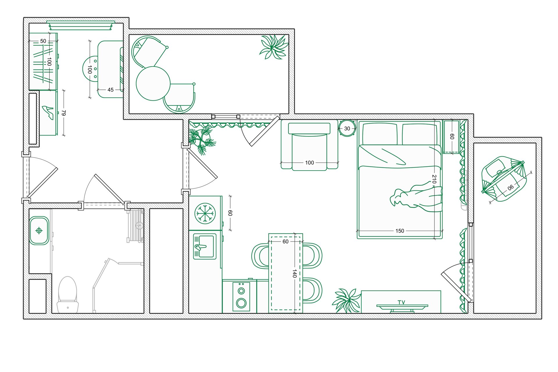 Эта небольшая сочинская студия — инвестиционный проект. Супруги приобрели ее, чтобы сдавать в посуточную аренду, а также останавливаться самим во время отдыха. Дизайнеру требовалось создать здесь универсальный интерьер, отвечающий потребностям и владельцев, и будущих гостей. Посмотрим, что получилось.