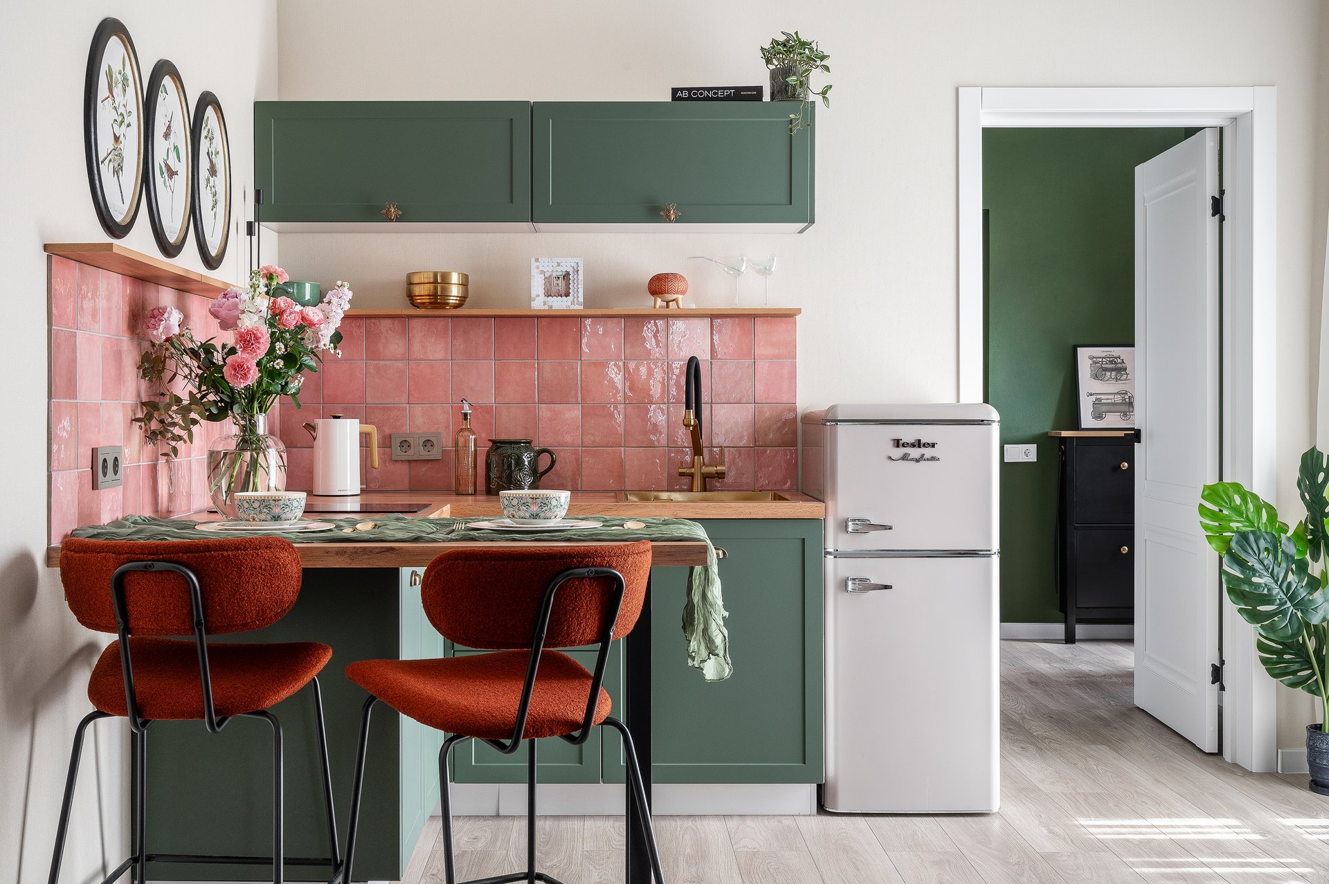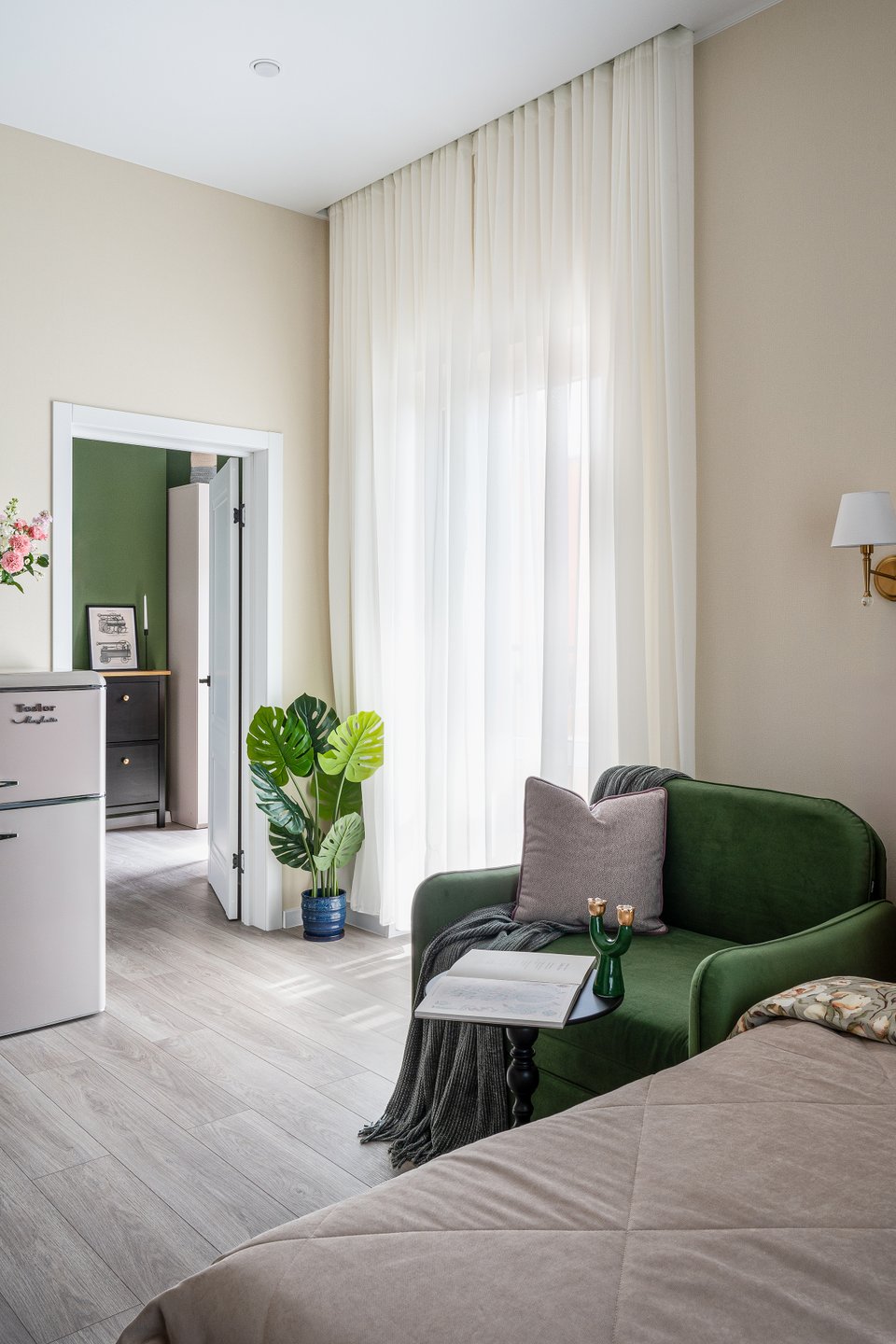 В студии сохранили отделку от застройщика. В роли акцентов выступают колор-блоки оттенков припыленной розы и шалфея, мебель и текстиль в винных и изумрудных тонах.