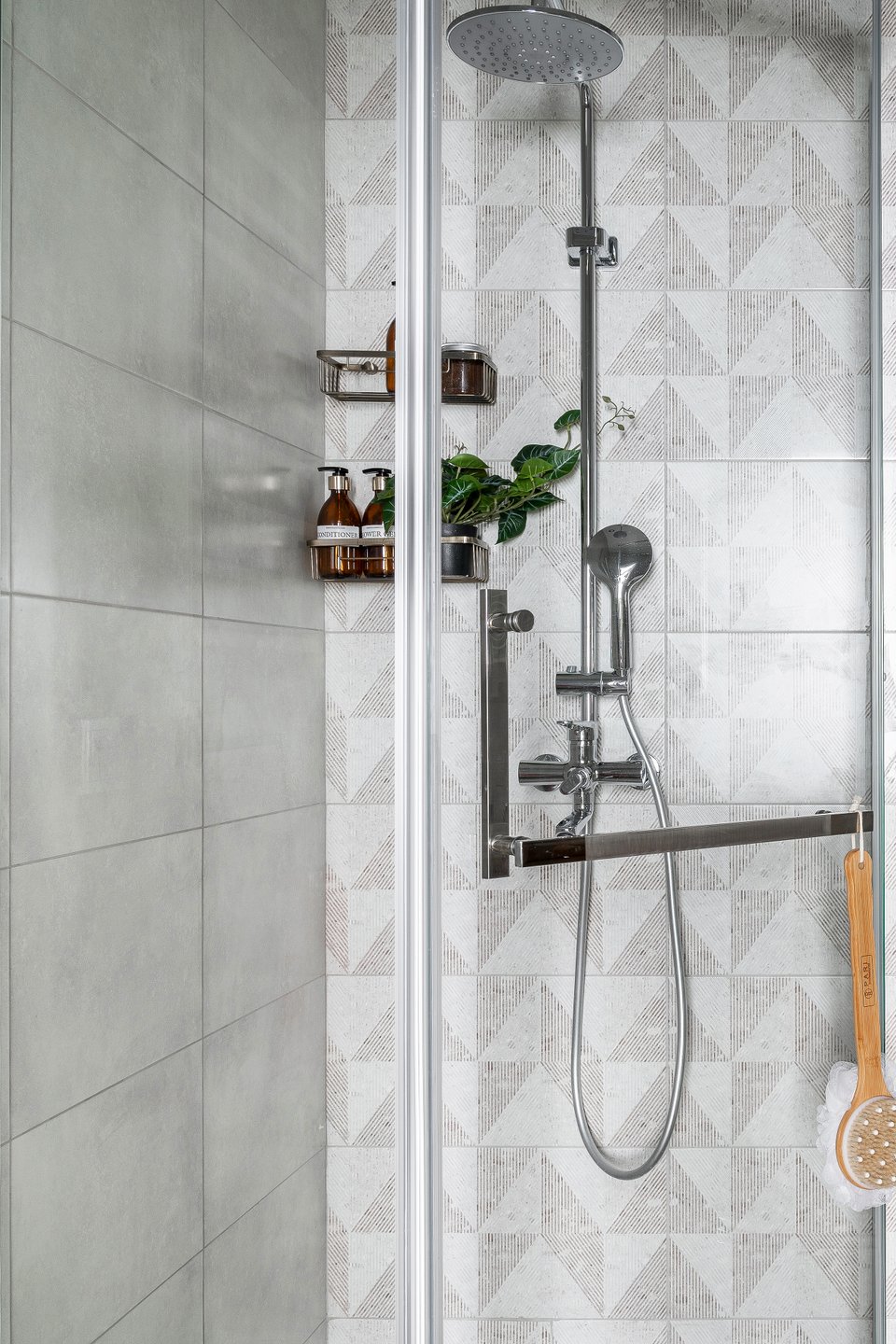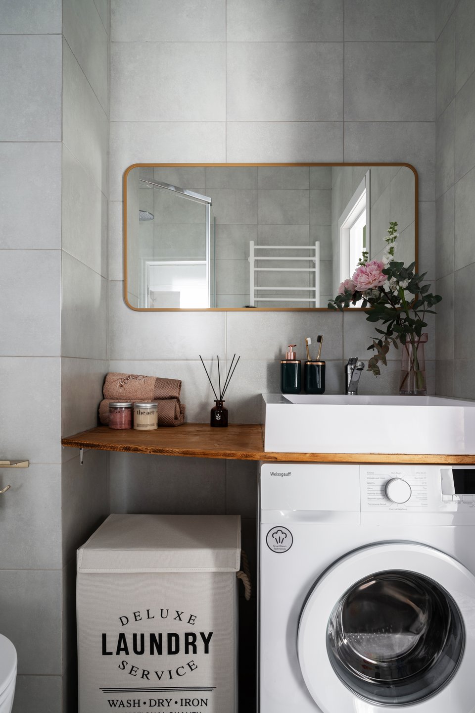 В санузле оставили отделку от застройщика. Установили компактный душевой уголок, в нише под раковиной разместили стиральную машину.