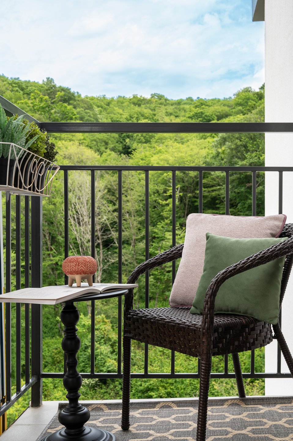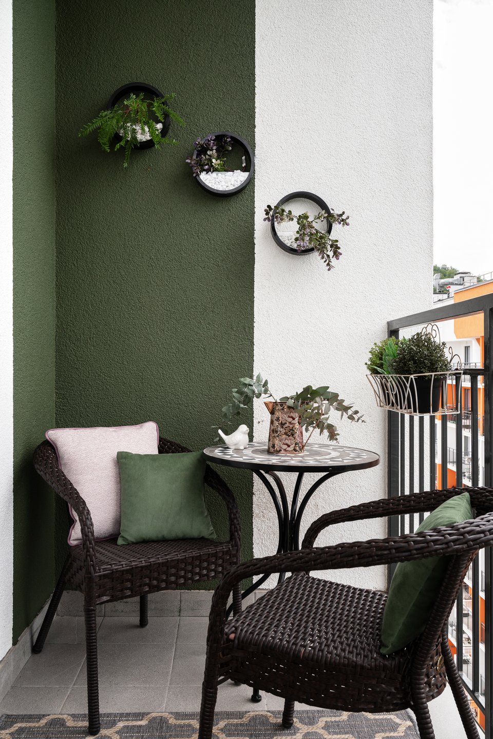 Достоинство планировки студии — сразу два открытых балкона. Их превратили в зоны отдыха с ротанговыми креслами и винтажными столиками.