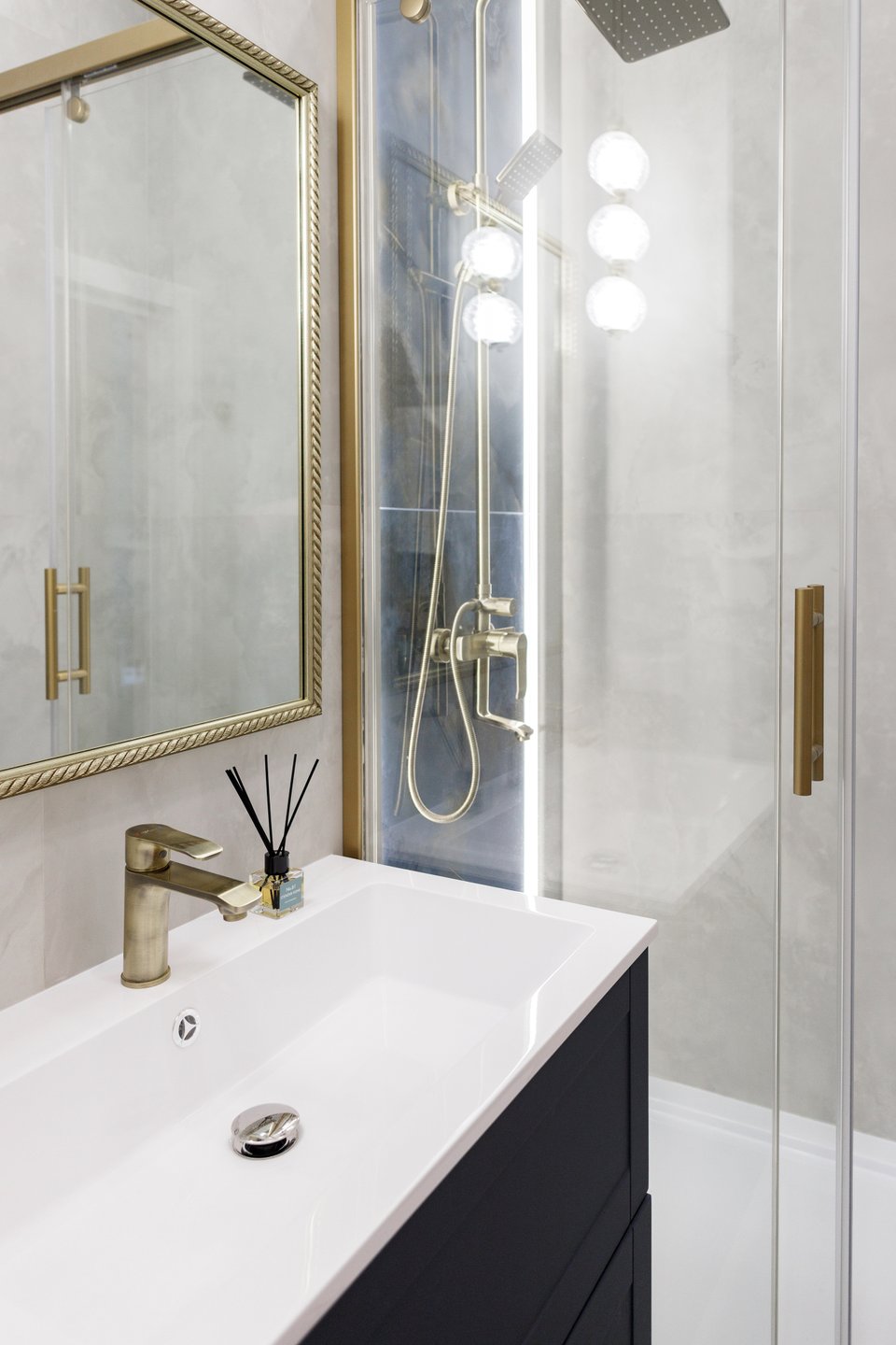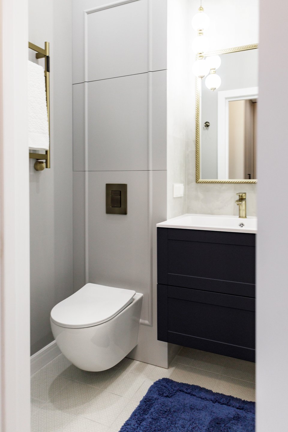 В совмещенном санузле установили просторную душевую, раковину с подвесной тумбой для хранения, унитаз с инсталляцией. «Декоративная вставка из синего керамогранита с подсветкой создает атмосферу расслабления и уединения при вечернем освещении, — комментирует дизайнер. — Детали интерьера в латунном цвете: рама зеркала, смесители в раковине и душевой, полотенцесушитель, подвесной светильник — добавляют пространству изысканности и утонченности».