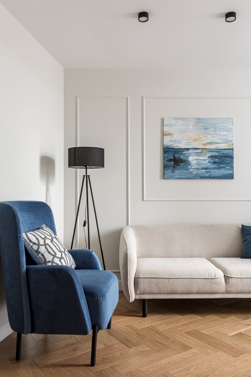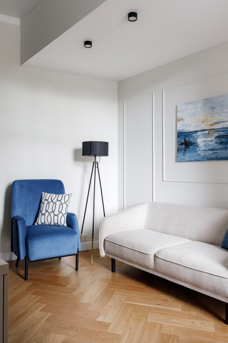 Светлая гостиная разделена на две функциональные части: зону отдыха с диваном и обеденную зона у окна. В качестве базового цвета для отделки выбрали белый, в роли акцентного — синий. Стены декорированы молдингами, которые отсылают к классической стилистике.