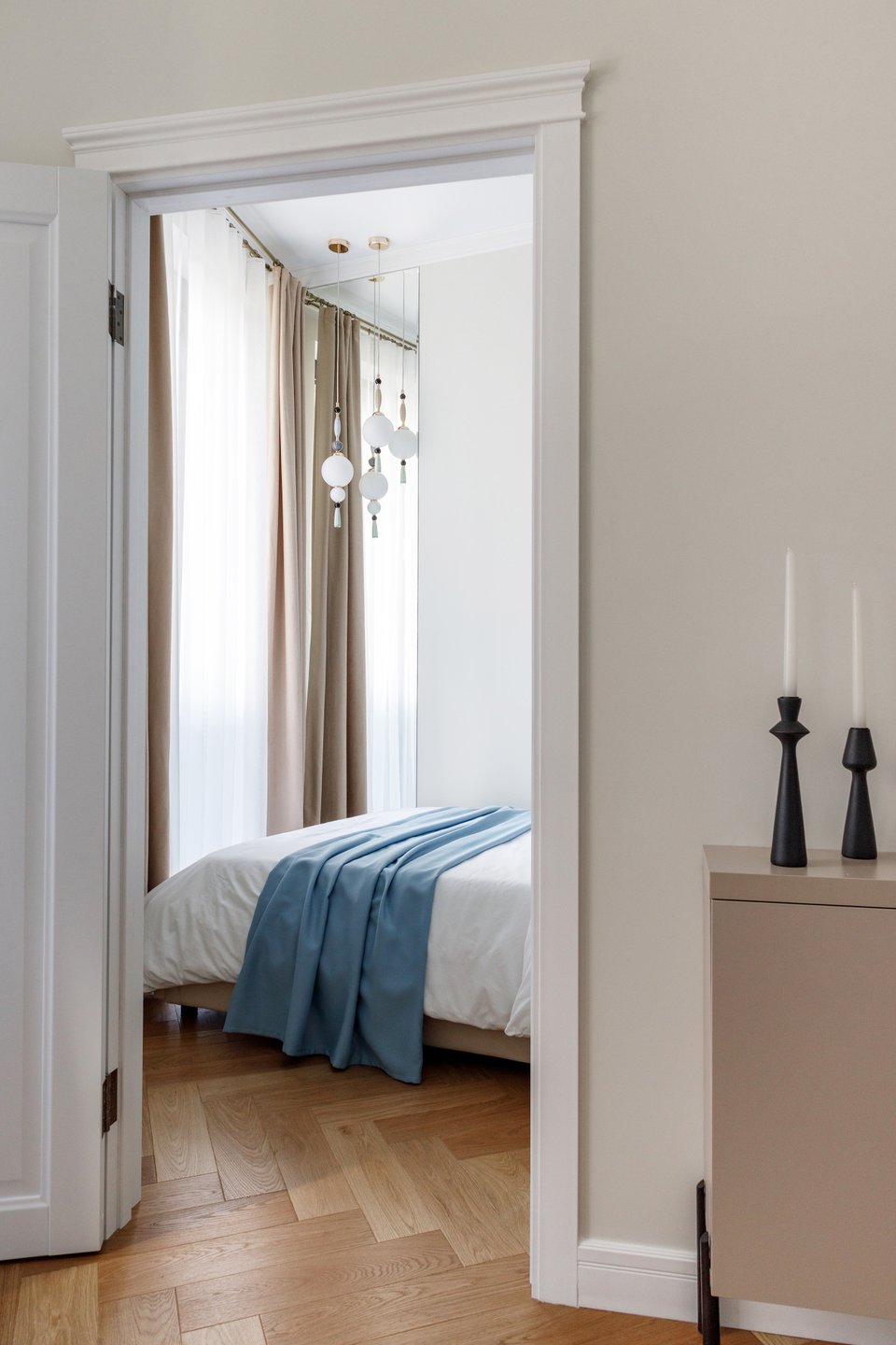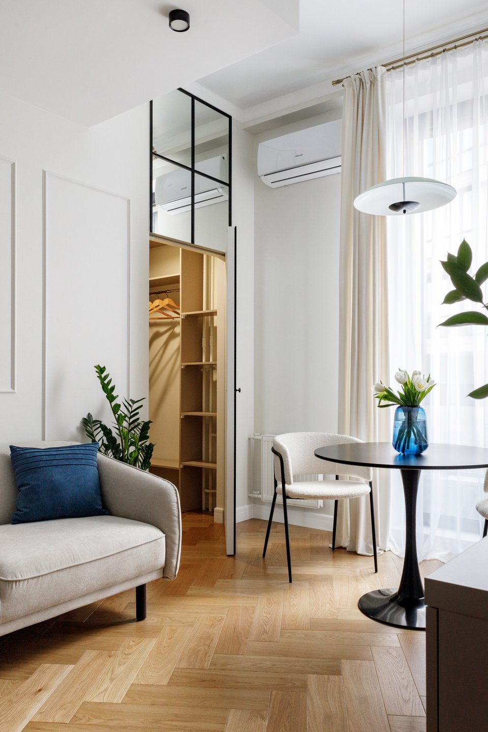 Особенностью этих апартаментов является необычная планировка — здесь практически нет прямых углов. А около одного из окон застройщик оставил нишу, из которой в ходе ремонта сделали гардеробную. В дизайне придерживались идеи создания светлого интерьера с элементами классики. Посмотрим, что получилось.