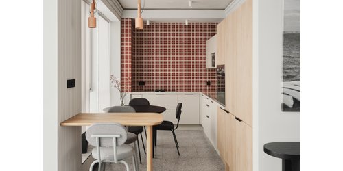 Для зоны готовки на этапе ремонта выстроили нишу. Угловой кухонный гарнитур изготовили на заказ. Вся необходимая бытовая техника встроена, фартук и столешница выполнены из искусственного камня и плавно «перетекают» друг в друга, создавая эффект целостности.