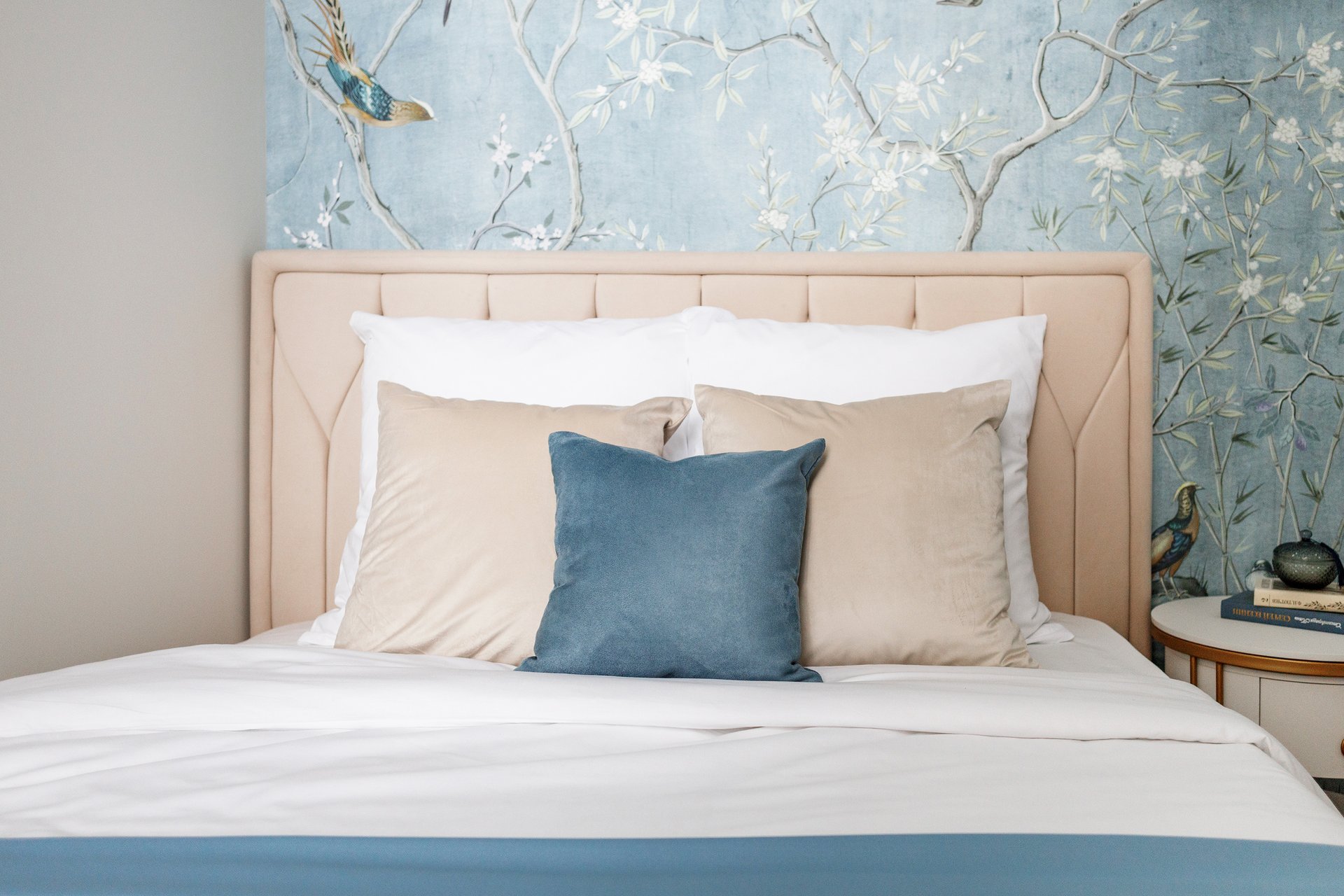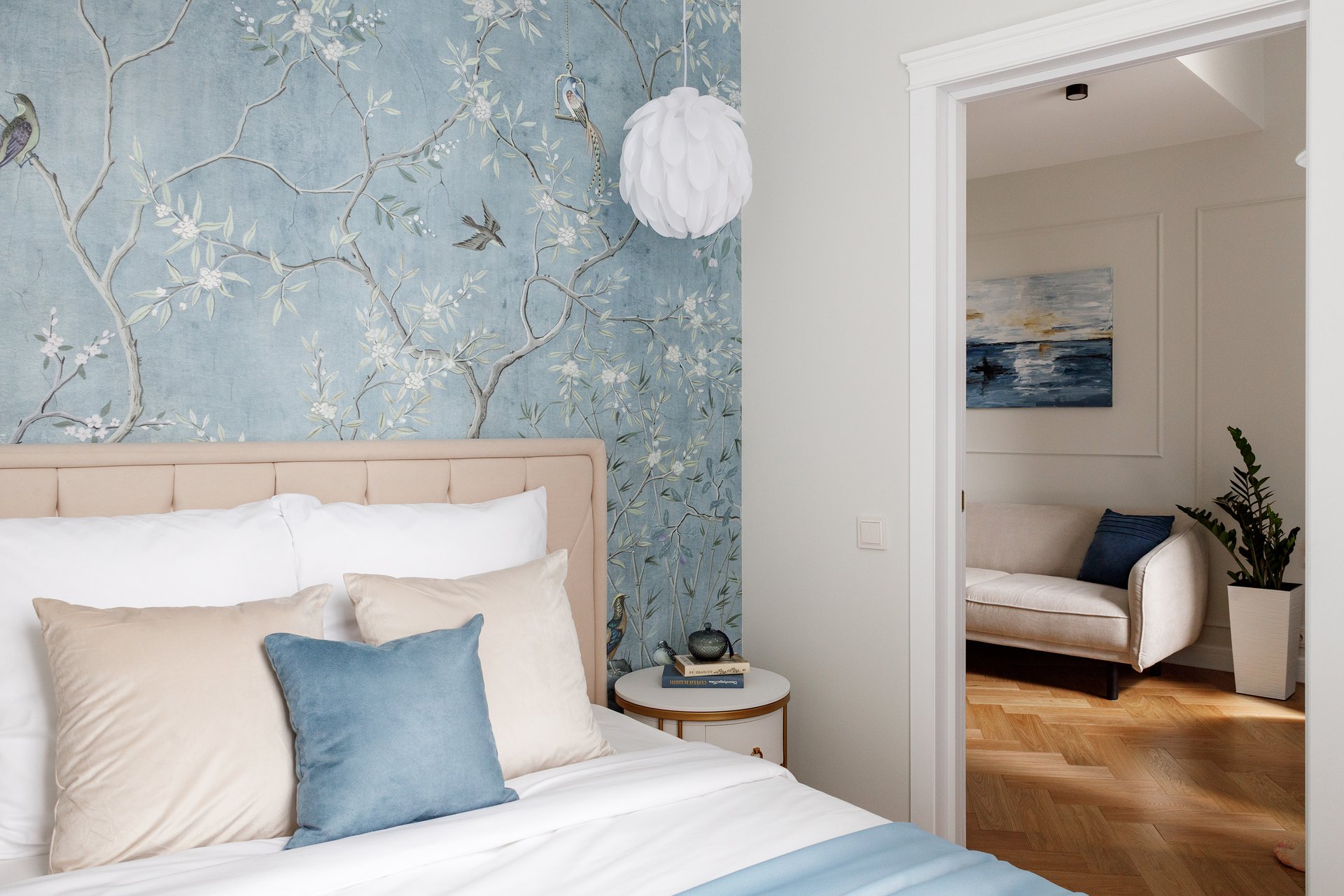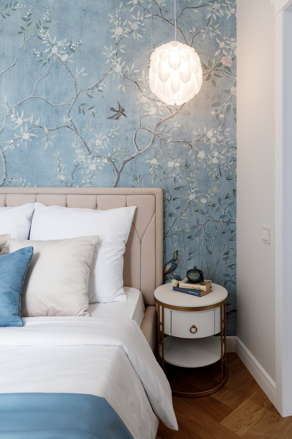 Стену за изголовьем кровати оформили дизайнерскими обоями. «Рисунок для этих обоев создается художником вручную, потом оцифровывается, — рассказывает автор проекта. — По нашим размерам рисунок был подогнан так, чтобы расположить обои на всю стену, и мебель не закрывала элементы рисунка».
