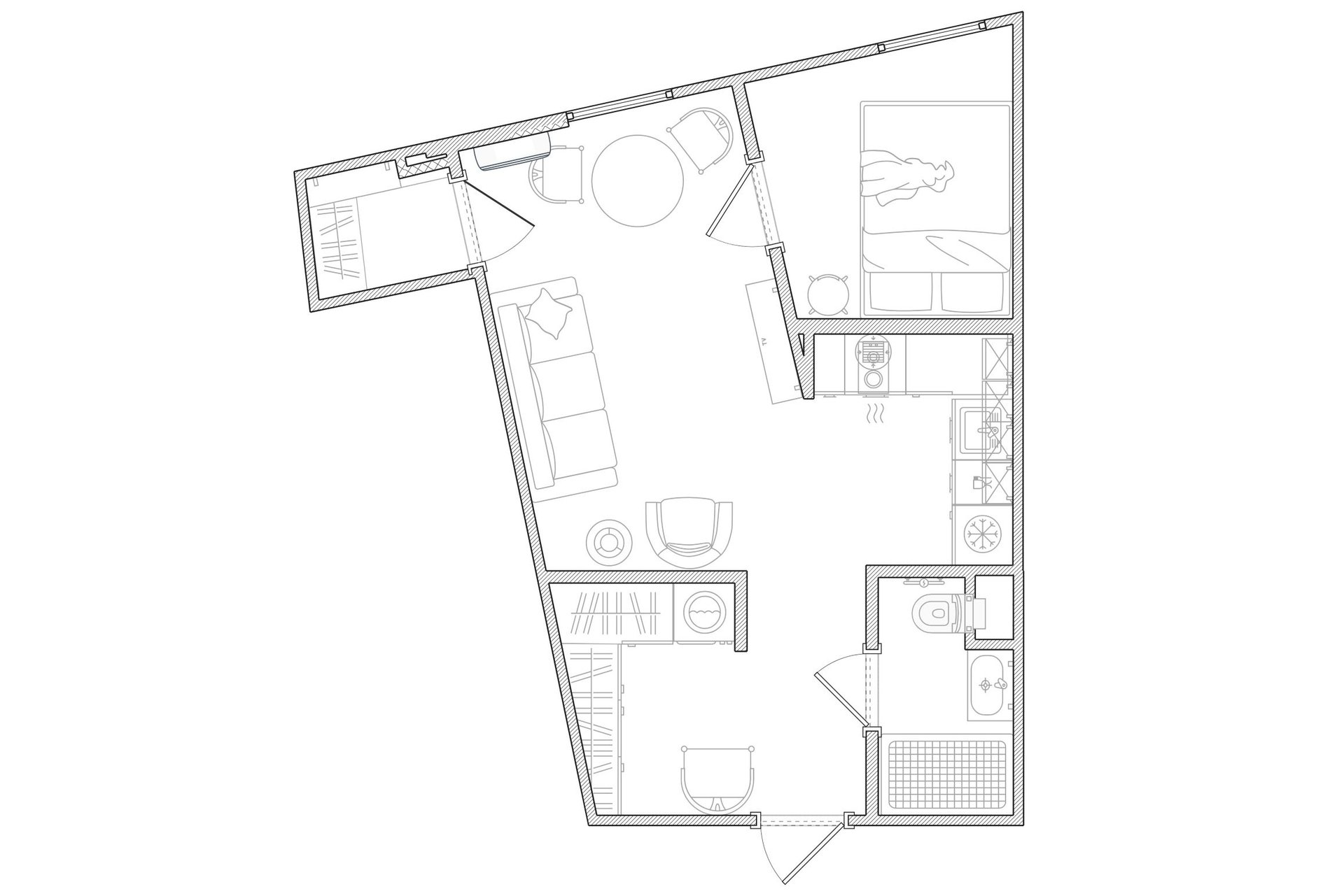 Застройщик сдавал квартиру со свободной планировкой. Комнаты организовали так, чтобы в каждой было окно, а значит и доступ естественного света. Зону готовки организовали в нише, выделили гардеробную и выстроили систему хранения в прихожей.