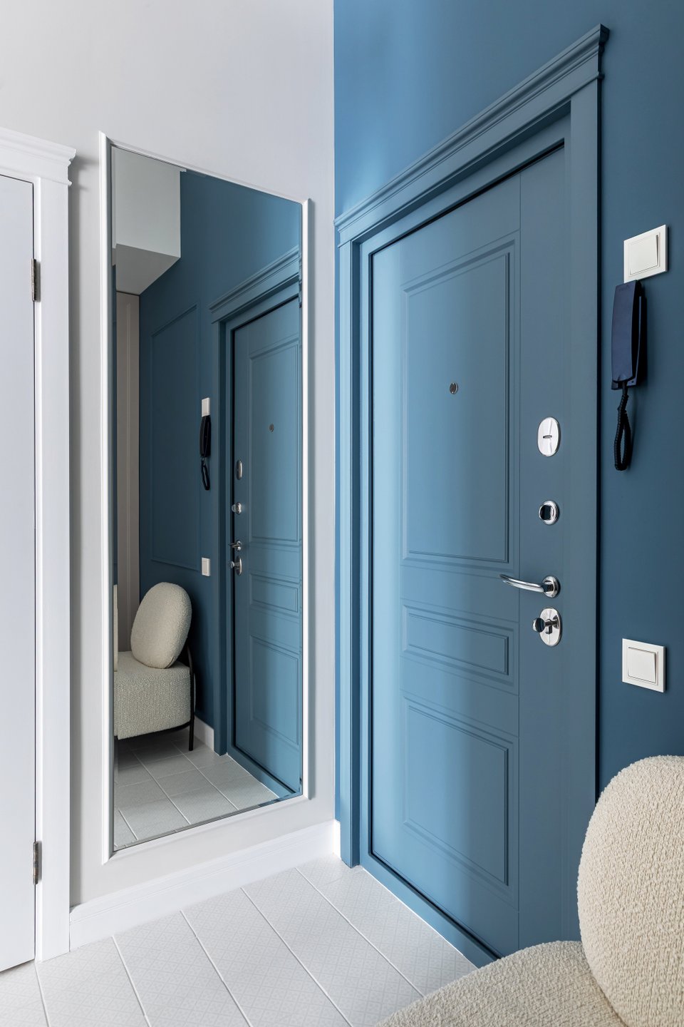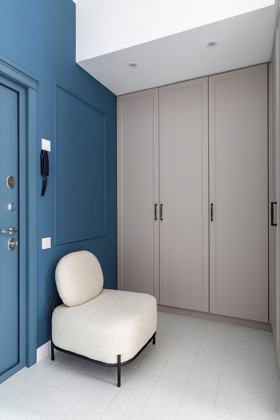 Пол во входной зоне выложили плиткой. Входную дверь и стену вокруг выкрасили в глубокий синий оттенок. Большой встроенный шкаф служит не только местом для хранения сезонных вещей, а также выполняет функцию постирочной — здесь организовали место для стиральной машины.