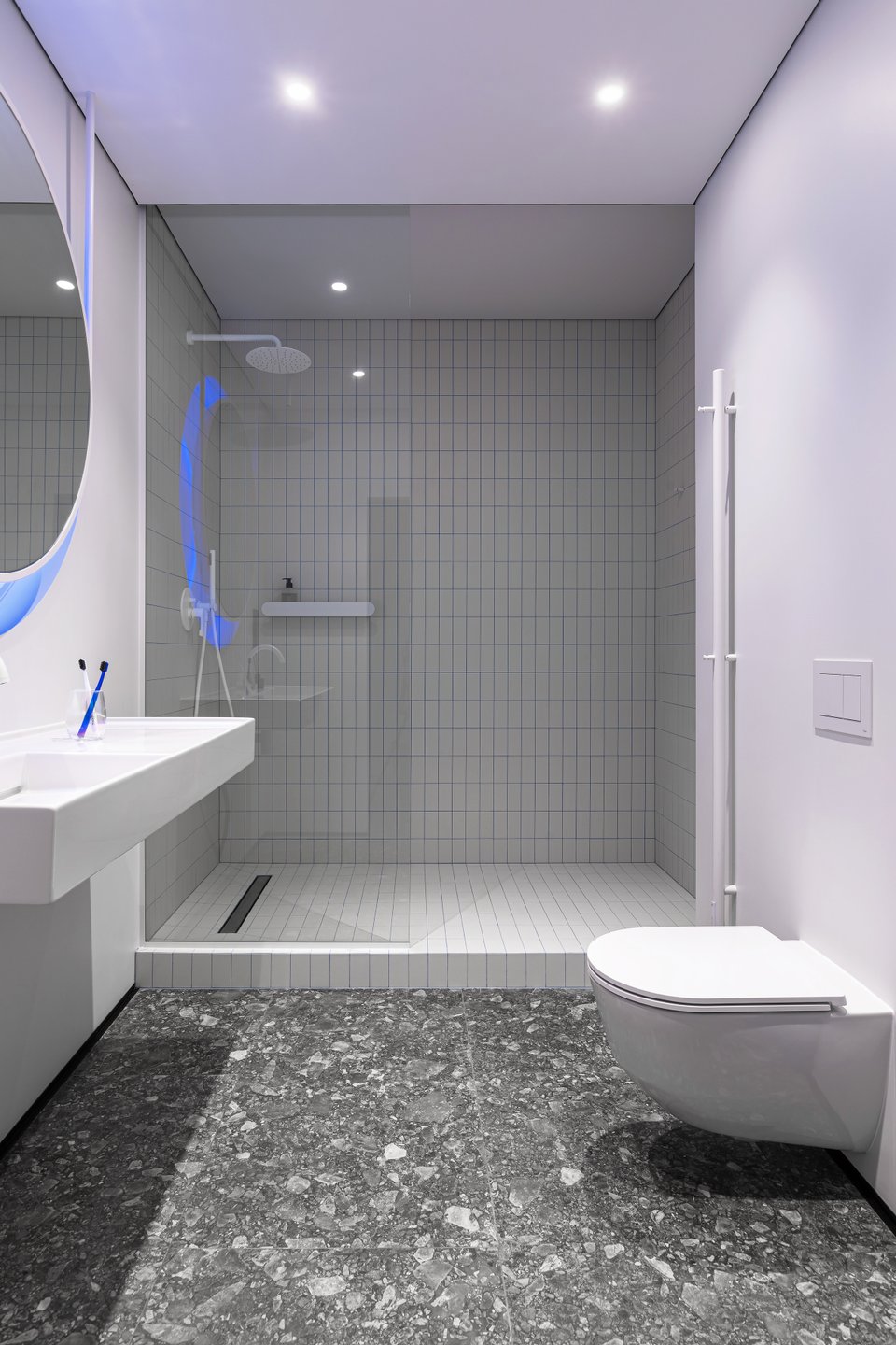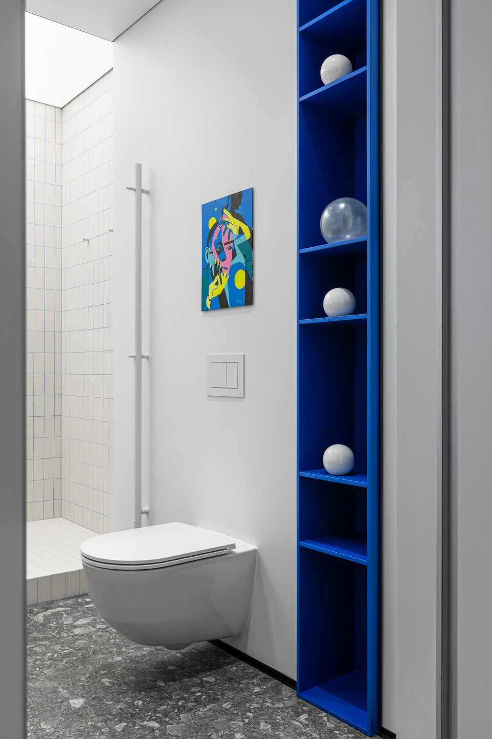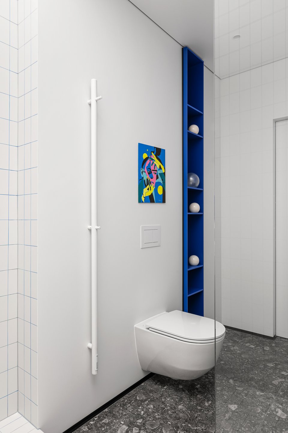 В санузле «окно» в гостиную замаскировали зеркалом, свисающим с потолка. На его оборотную сторону прикрепили диодную RGBW-ленту. Также здесь спроектировали просторную душевую, повесили раковину и унитаз с инсталляцией. Стены покрасили влагостойкой краской, мокрую зону выложили плиткой. Все детали подобраны белые, даже смесители — акцентными выступают лишь пол в керамограните, яркая картина над инсталляцией, пенал и подсветка зеркала.