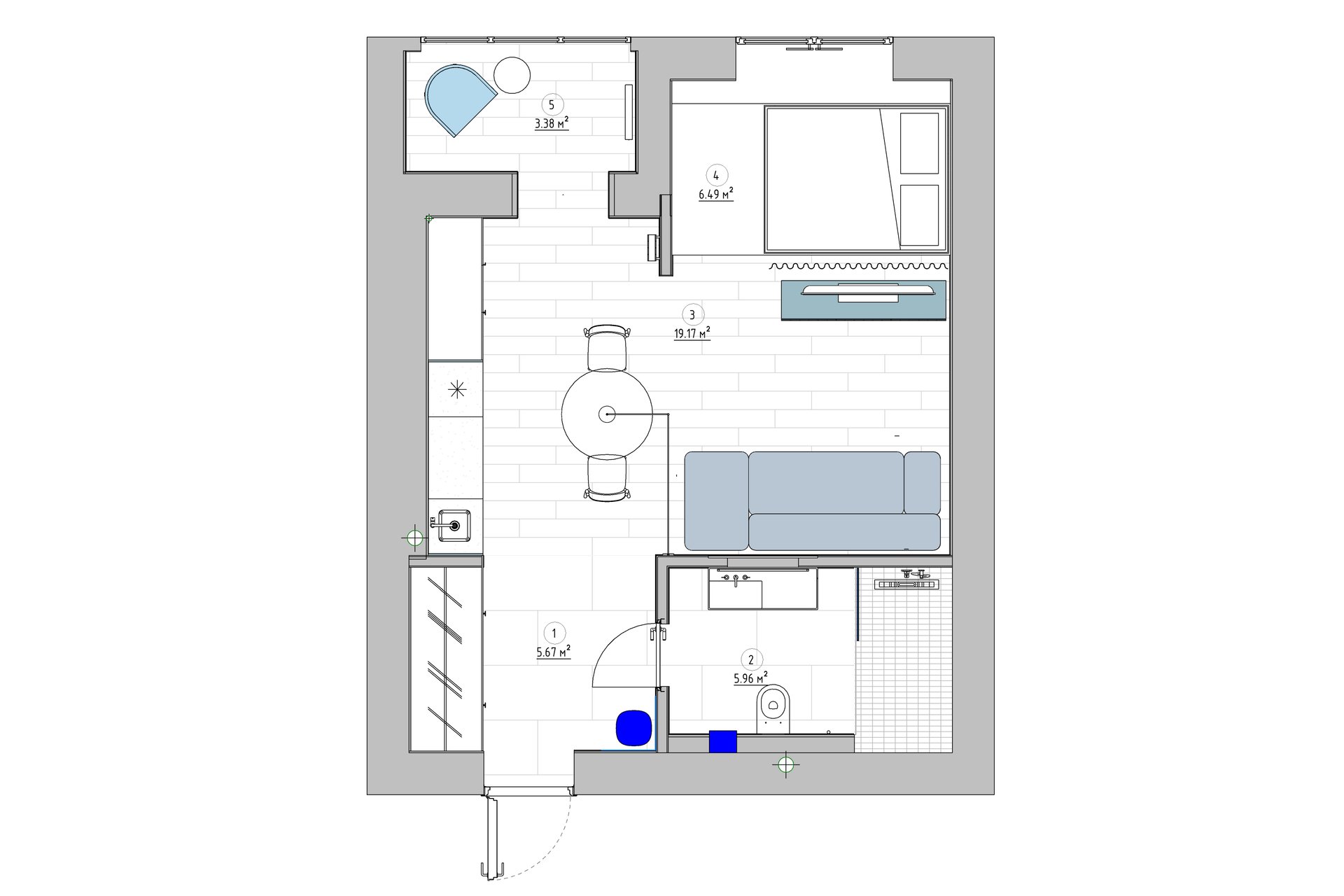 В проекте была реализована частичная перепланировка: кухню и жилую комнату объединили. На 40 кв.м выделили зону для отдыха с диваном и телевизором, спальню, кухню с обеденной группой. В квартире есть лоджия с панорамным остеклением, санузел и прихожая.