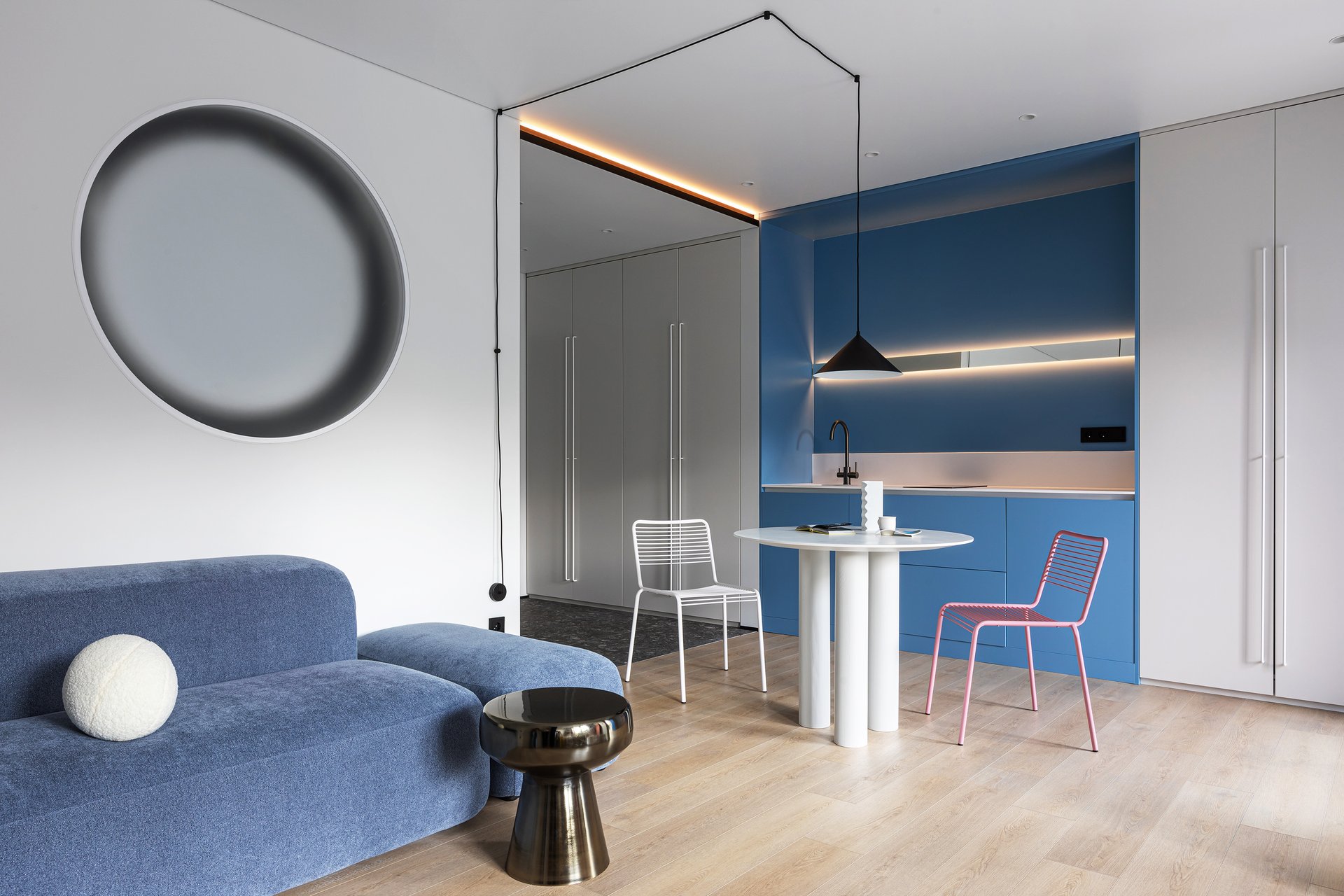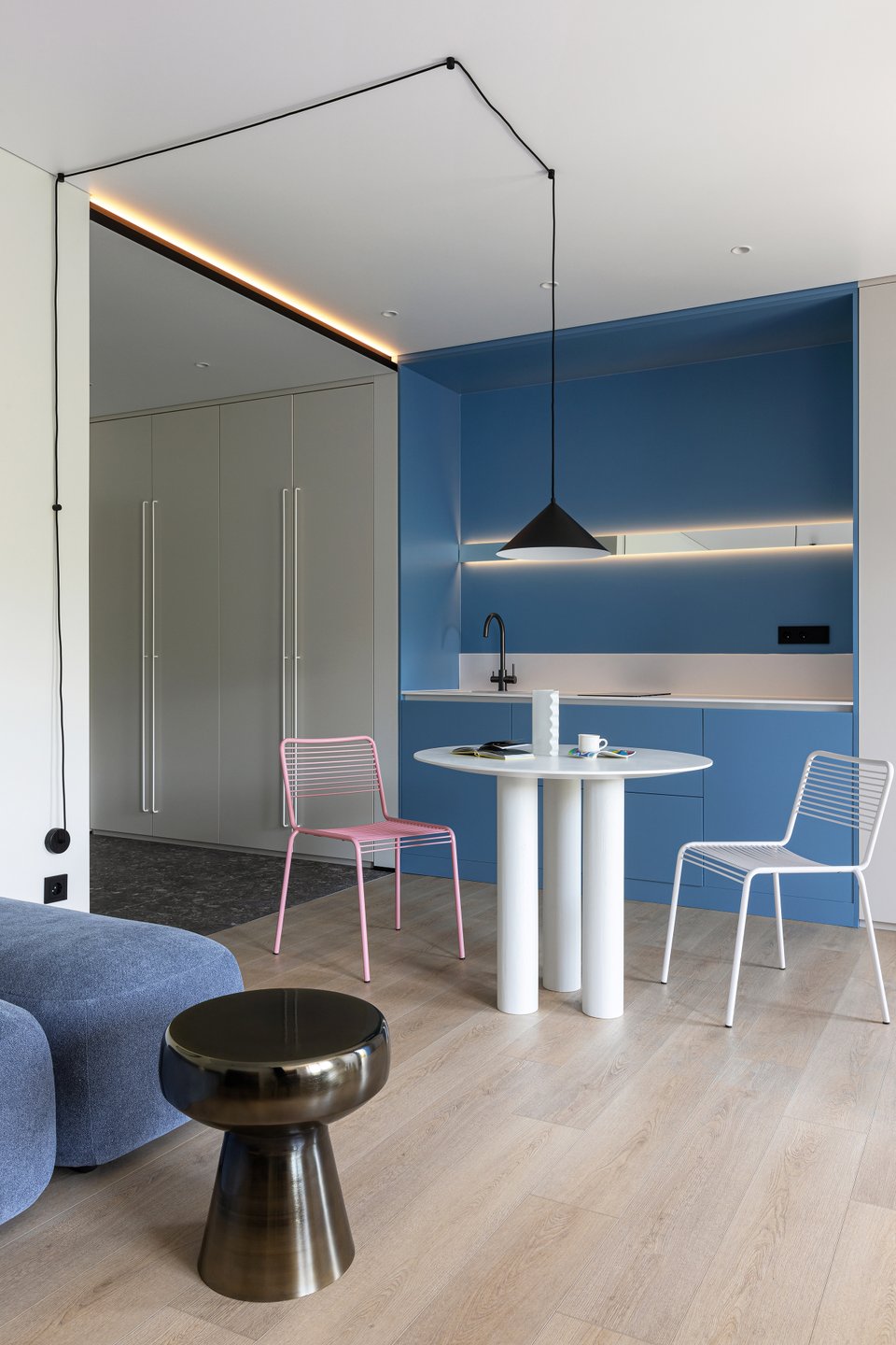 Небольшую кухню установили в нише и выделили акцентным синим. Зеркальные вставки в комбинации с подсветкой «углубляют» верхний ярус и эффектно выделяют зону приготовления еды. В белом шкафу по правую руку от гарнитура спрятали мини-холодильник, микроволновку, а также стиральную машину. Индукционной плиты на две конфорки вполне достаточно для отпускной квартиры. Стандартную вытяжку ставить не стали — ограничились приточной вентиляционной.
