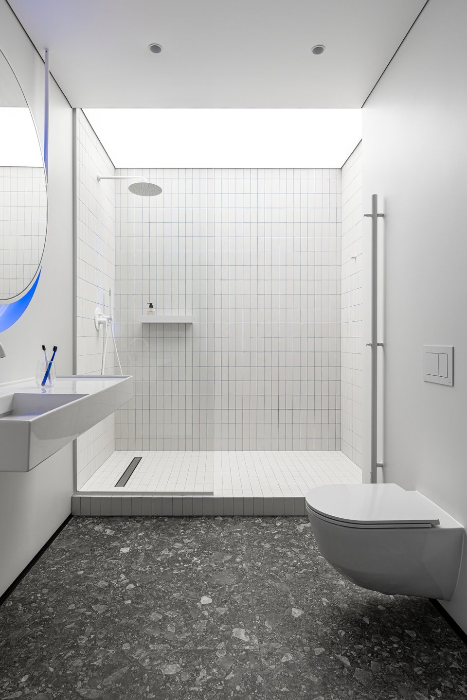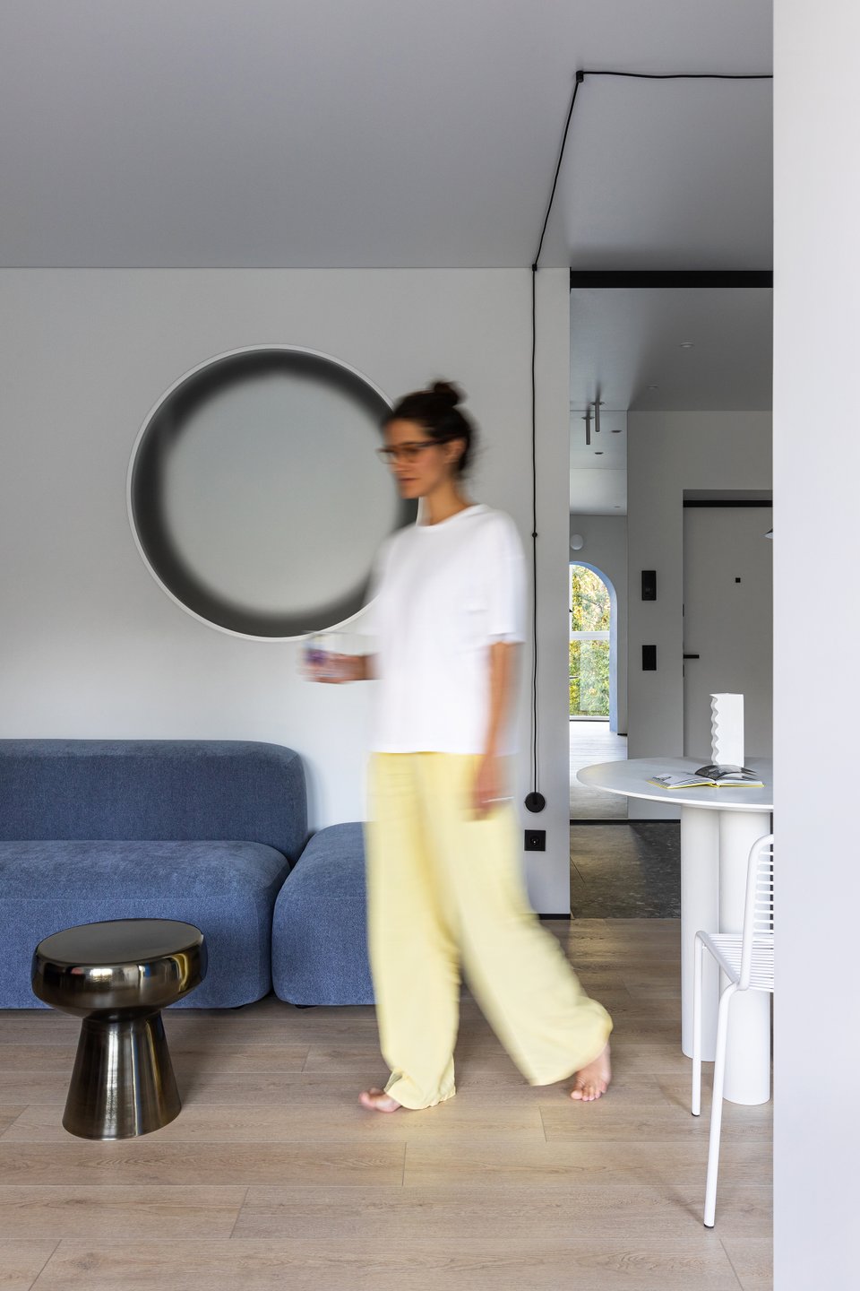 В этом интерьере много прямых углов и четкой геометрии, поэтому важно было смягчить пространство округлыми формами. Так у дизайнера родилась идея круглого окна между ванной и гостиной. Посмотрим, что получилось.