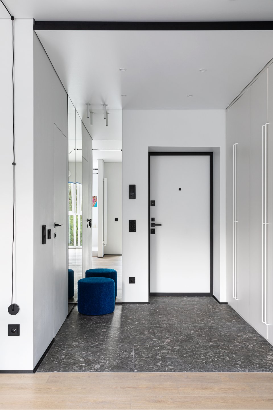 В прихожей спроектировали встроенную систему хранения. Глубина шкафа 70 см — владельцы говорят, здесь хватает места для вещей семьи даже при длительном проживании. Пространство визуально расширили с помощью двух зеркальных поверхностей до потолка, дополнительное освещение усиливает этот эффект. Связывающим прихожую с остальным интерьером «звеном» выступает мягкий пуф Кофи от divan.ru.