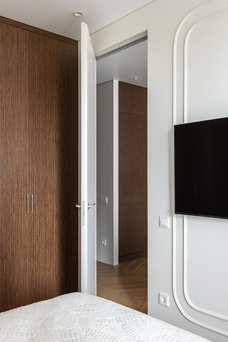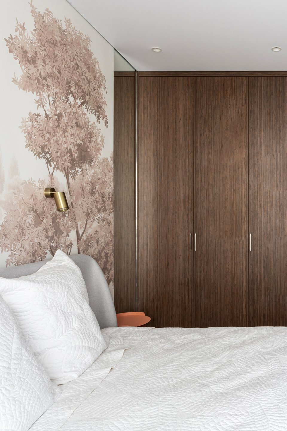 «Фреска в спальне — не просто декор, а эмоциональный жест, который каждый день задает настроение, — рассказывают дизайнеры. — Заказчики хотели уютную спальню с картинкой за изголовьем, поэтому мы декорировали стену изображением с деревьями. На входе в комнату спроектировали гардеробный шкаф, около кровати — туалетный столик. Терракотовая тумба Раума от divan.ru и изящные бра добавляют акцентов. Зону ТВ обыграли гибкими молдингами, чтобы смягчить графичность экрана и гармонично вписать его в интерьер».