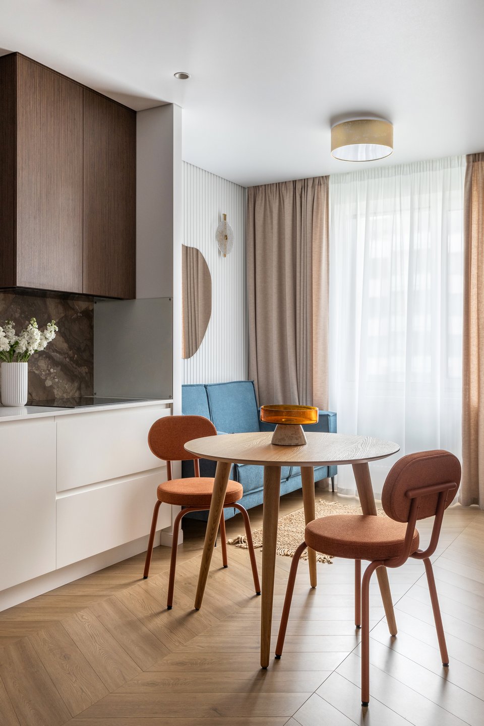 «Работая над интерьером, мы вдохновлялись настроением “утреннего света”, — рассказывают дизайнеры. — Оттенки пудры в квартире мягко “окрашивают” воздух, дерево создает тепло, а яркие акценты оживляют каждый метр. Получился современный интерьер с легкими скандинавскими нотками и авторскими штрихами».