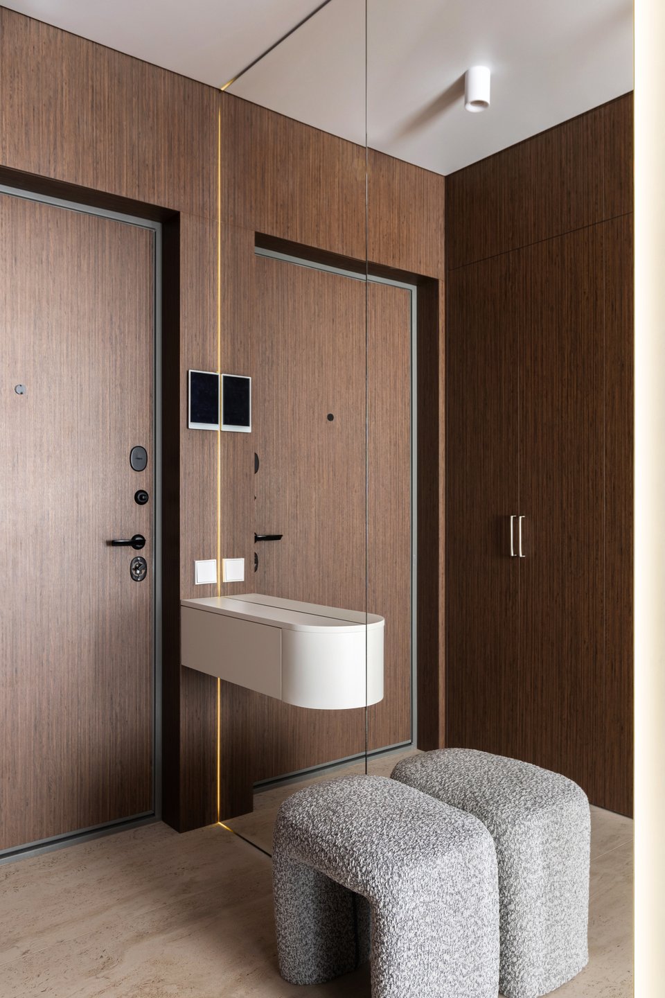 Прихожая оснащена просторной системой хранения с выдвижными полками для обуви, а также вешалками для сезонной одежды. Зеркальная поверхность с подсветкой напротив шкафа визуально расширяет и углубляет пространство. Подвесная мини-консоль служит для хранения нужных мелочей, а уютный мягкий пуф Кропс от divan.ru ежедневно встречает и провожает хозяев квартиры.