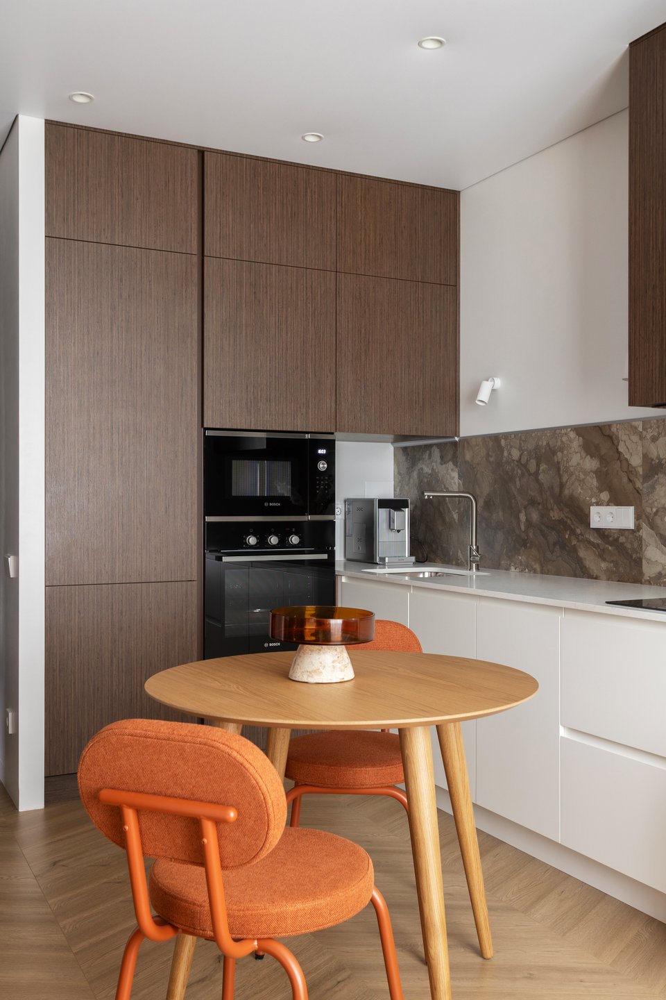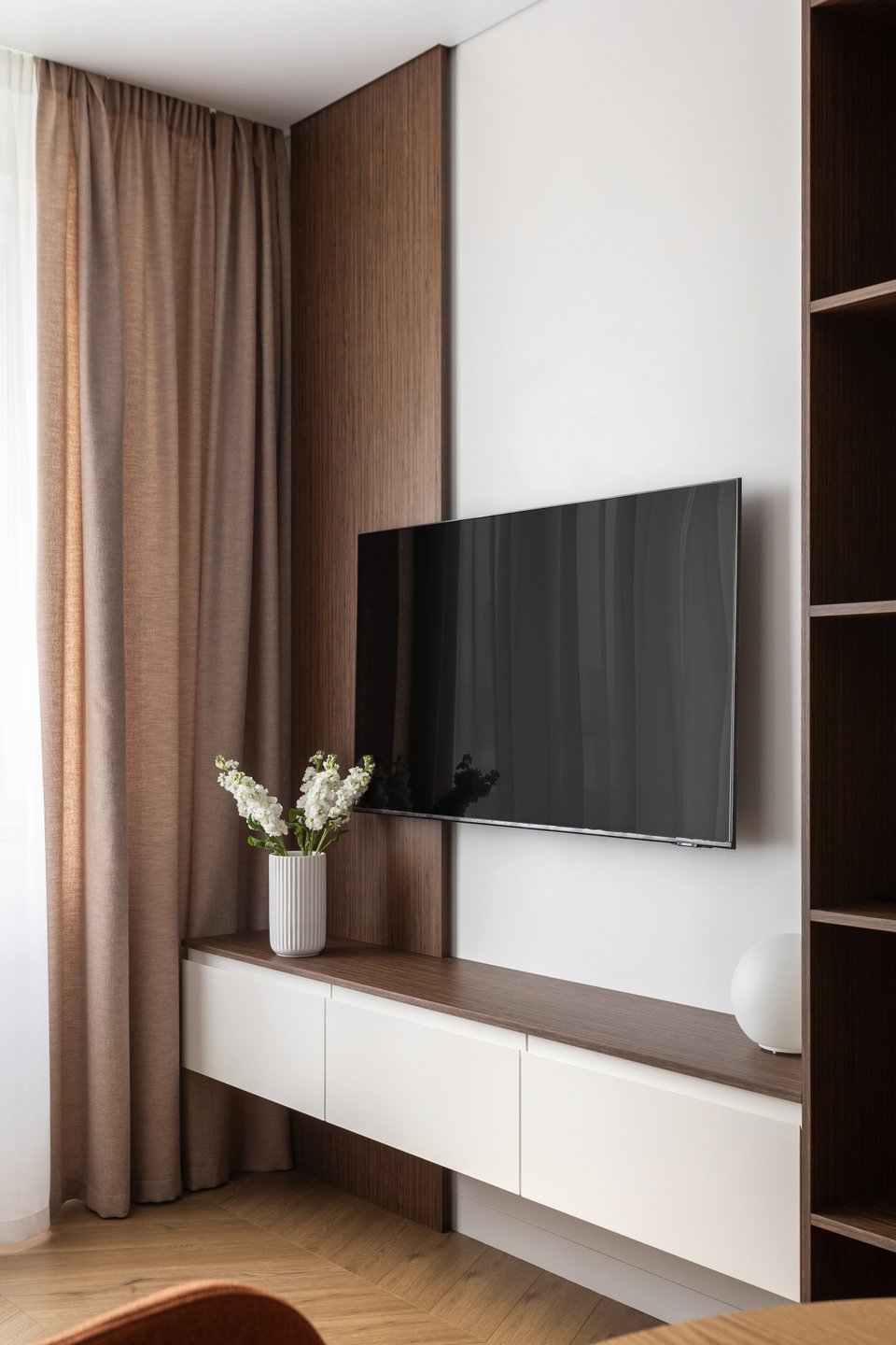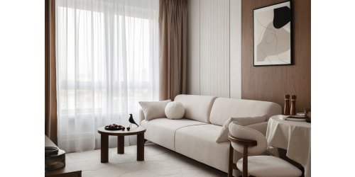 В этой квартире живет молодая пара. Дом находится в новом ЖК, но лес буквально в двух шагах от подъезда — городской формат жилья здесь сочетается с атмосферой загородного дома: тишина, зелень и ощущение отдыха прямо за окнами.