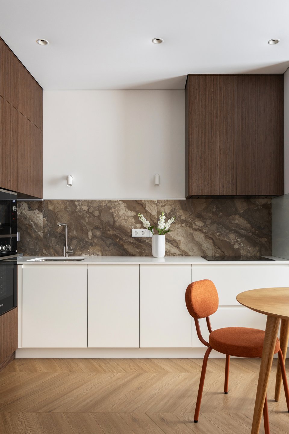 Угловой кухонный гарнитур изготовлен на заказ. Столешница из кварцевого агломерата, фартук — из керамогранита 120 х 60 см под камень. Стена напротив окна занята встроенными пеналами. На смежной стене повесили только один шкаф для хранения — чтобы не «перегрузить» пространство.