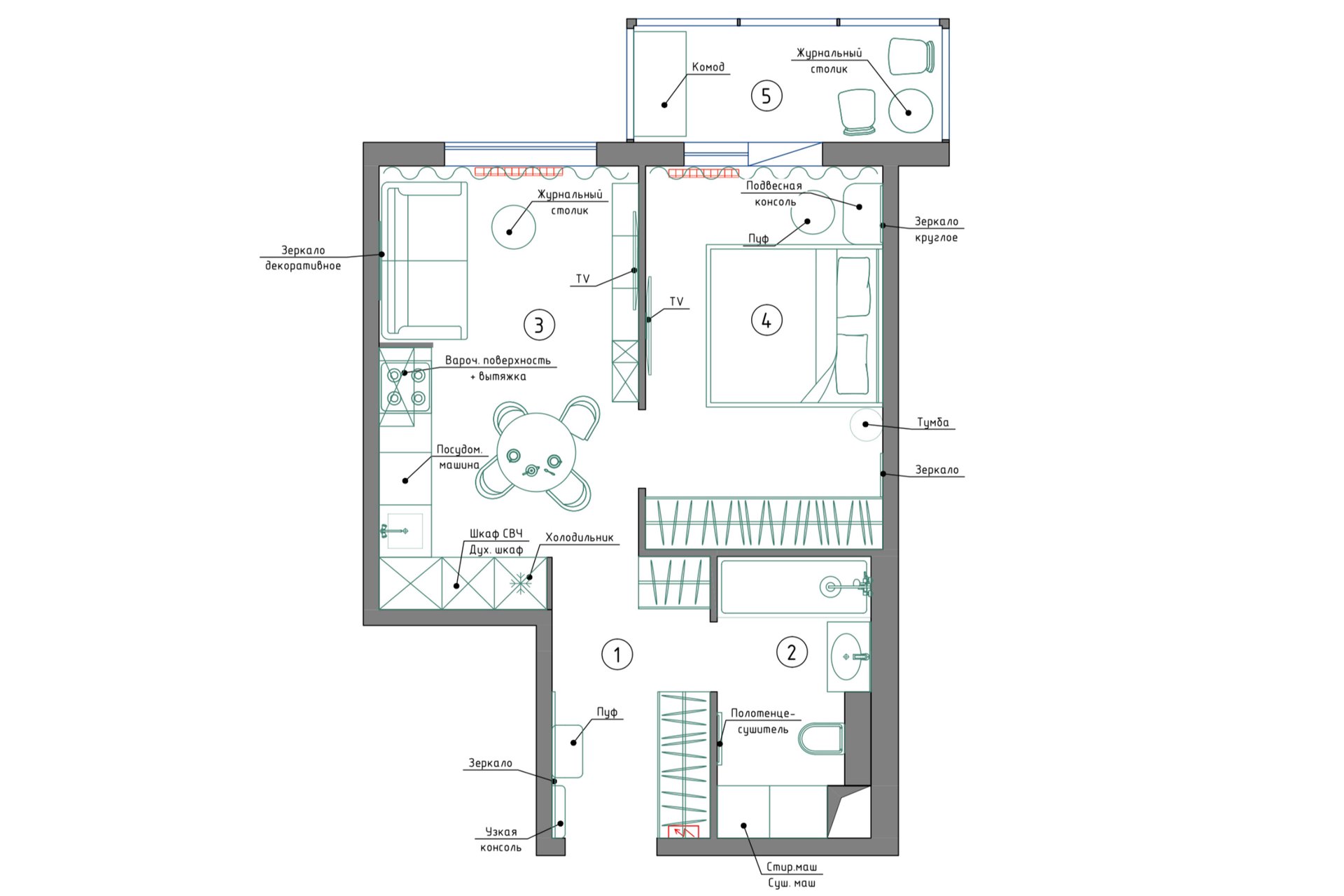 - Уютное пространство для жизни вдвоем, с возможностью приема гостей.