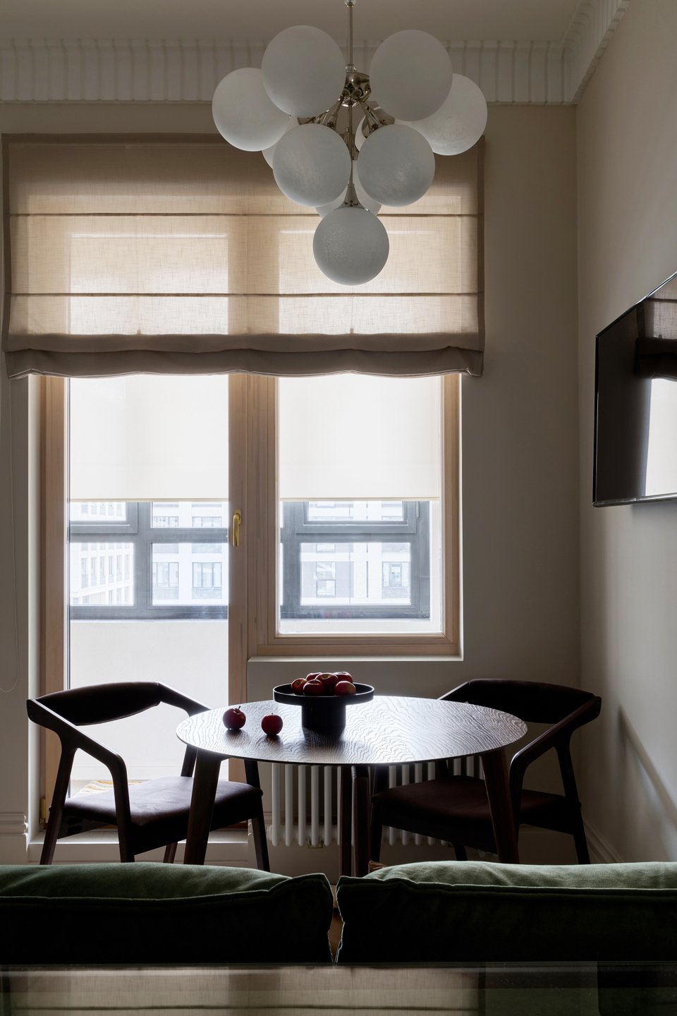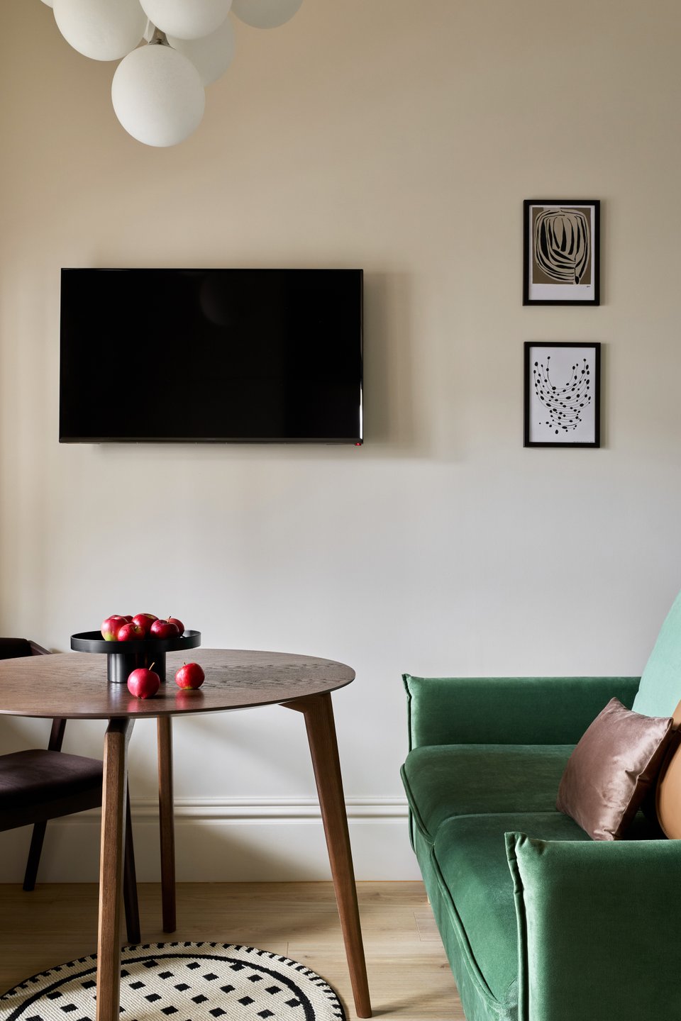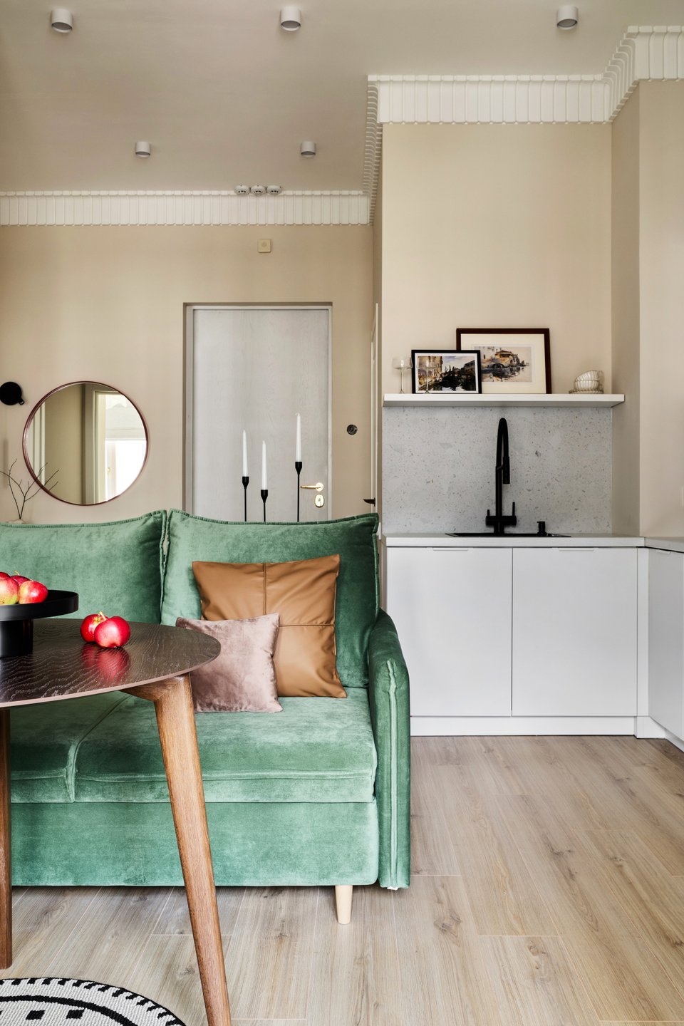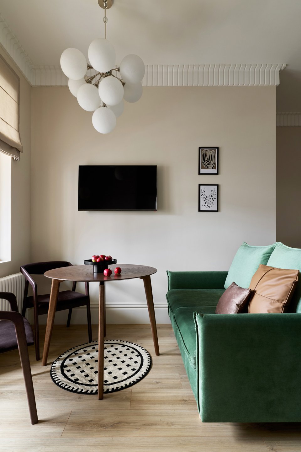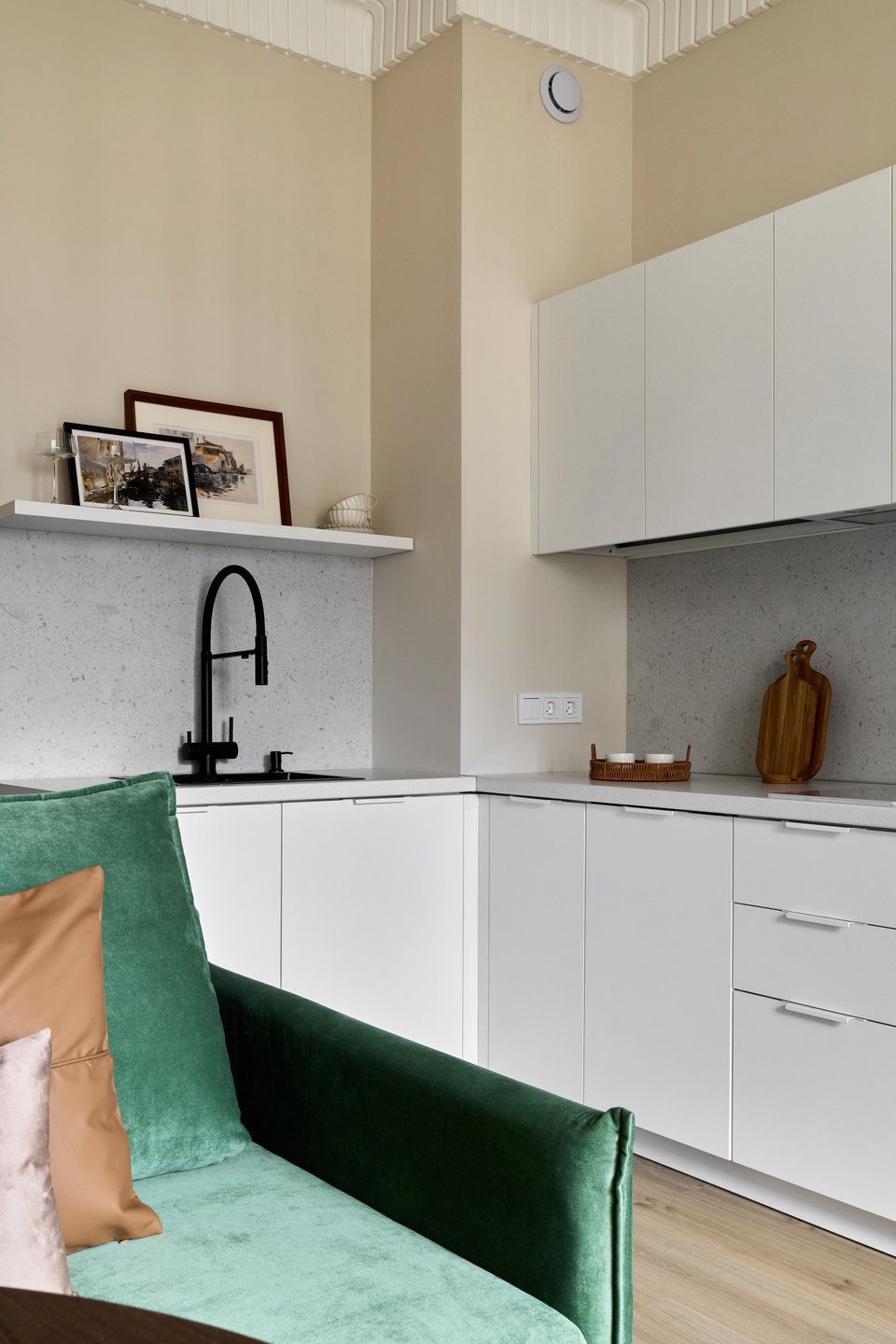 На площади 12,6 кв.м совмещены две функциональные зоны — кухня и столовая. Для гибкости пространства выбрали раскладной диван Слипсон Мини от divan.ru: при необходимости стол и стулья отодвигаются, а диван трансформируется в спальное место. Обивку изумрудного цвета выбрали в «Конструкторе» из палитры бренда.