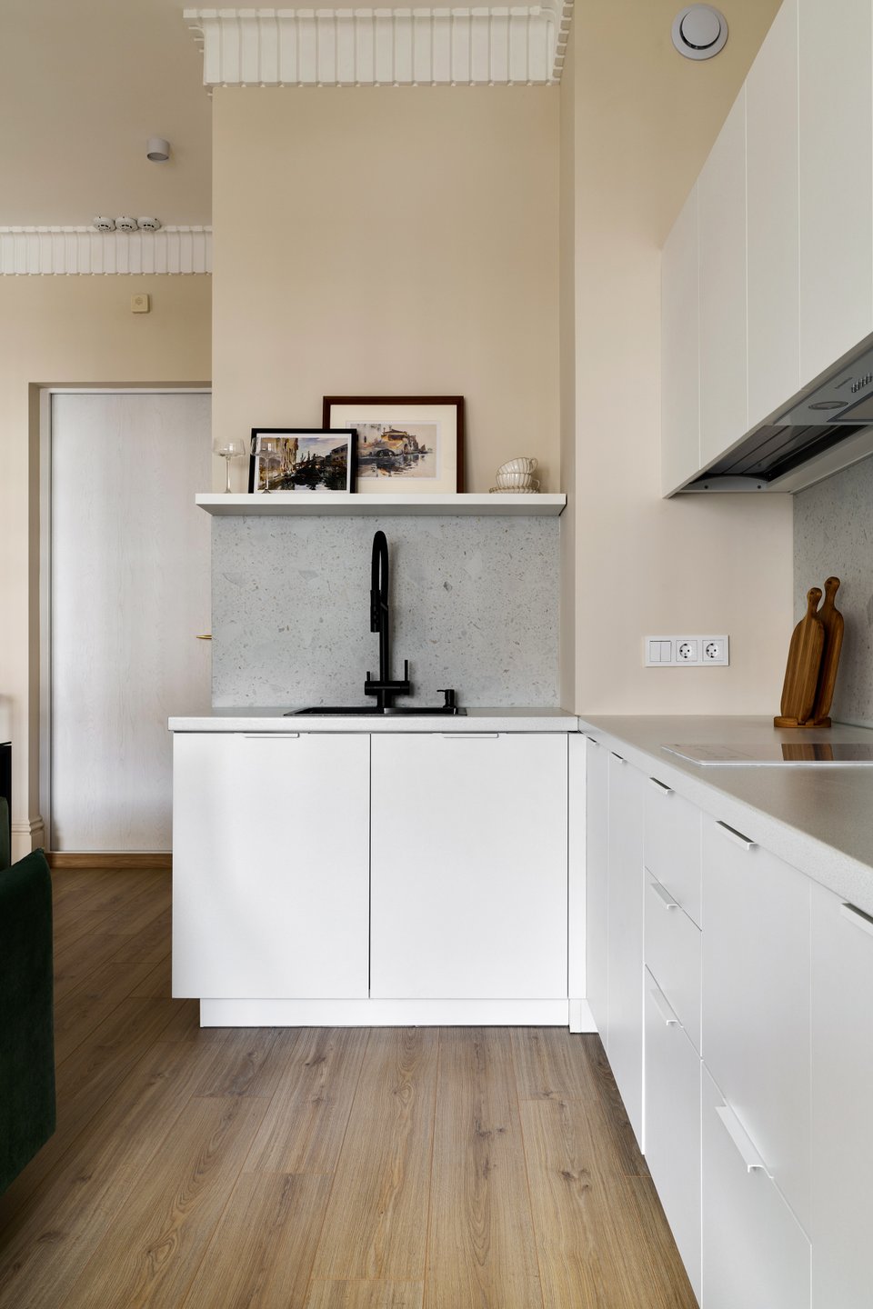 Прием: чтобы избежать излишнего минимализма, в интерьере использован широкий полиуретановый карниз — декоративный акцент под потолком, не нарушающий визуальной легкости пространства.