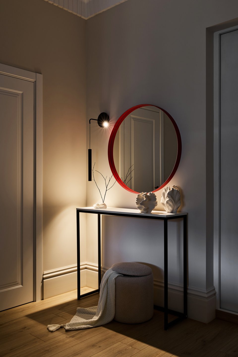 В зоне прихожей сделан акцент на функциональность: здесь размещены консоль, пуф и зеркало в яркой красной раме. Особое удобство обеспечивает прямой выход из прихожей в изолированную гардеробную.