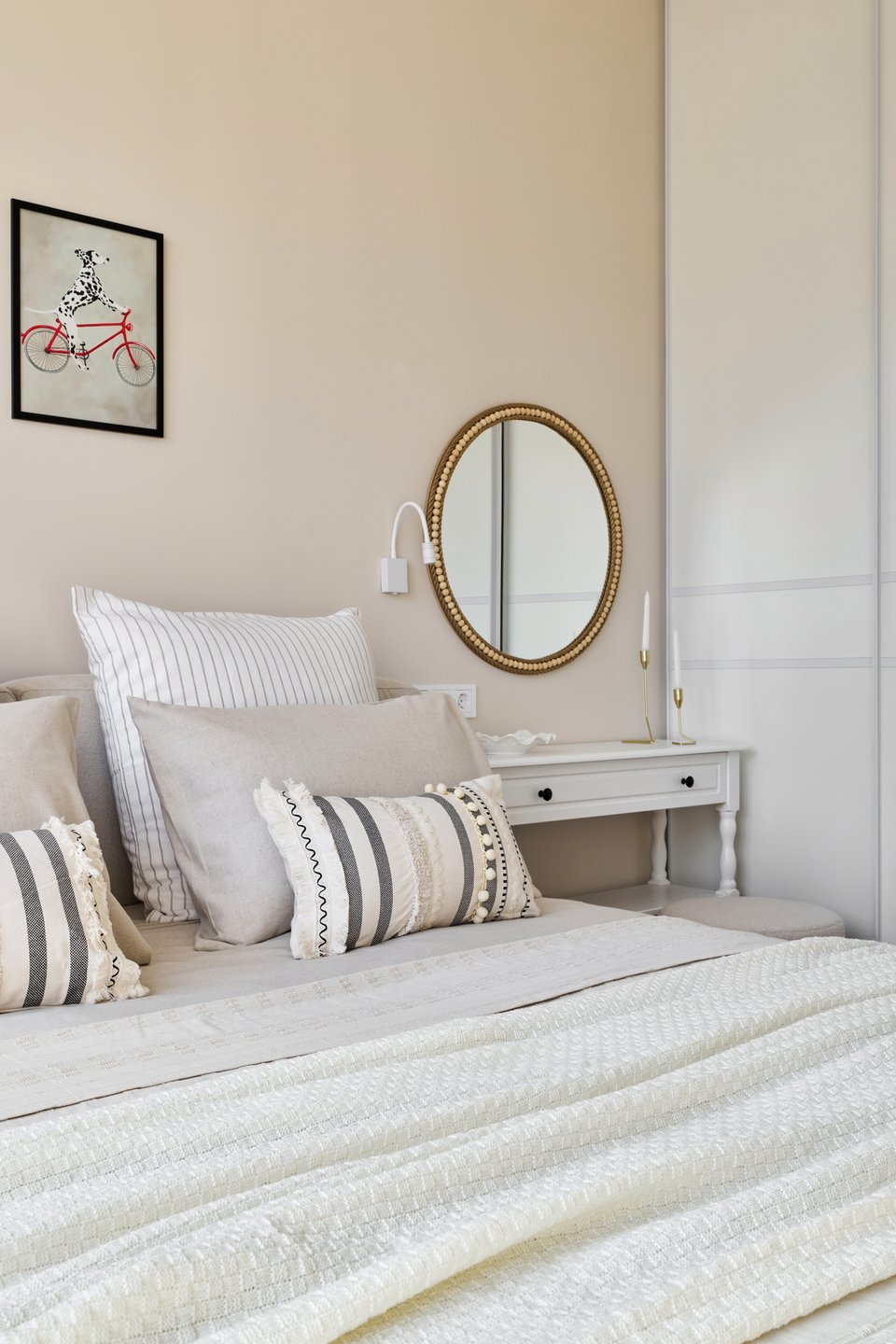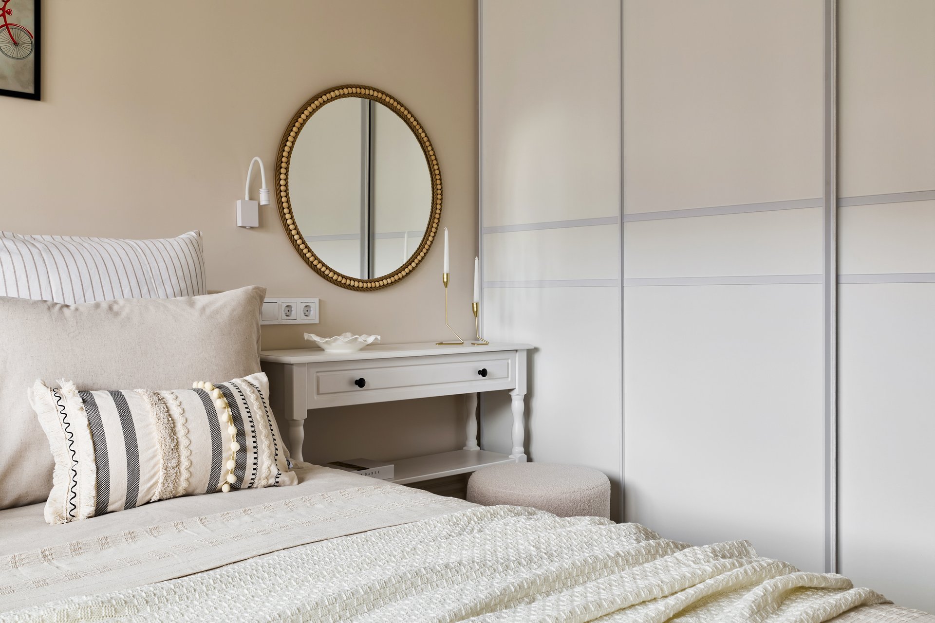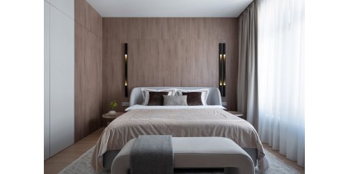 В комнате отдыха ключевым элементом стала кровать бежевого оттенка. Вдоль стены напротив окна спроектировали шкаф‑купе со штангами и бельевыми полками.