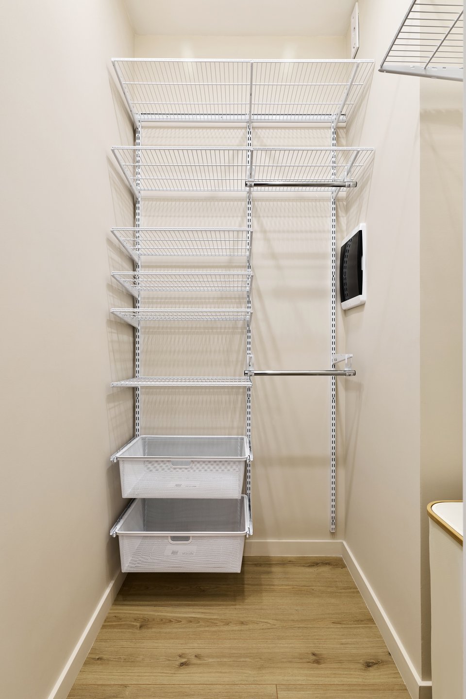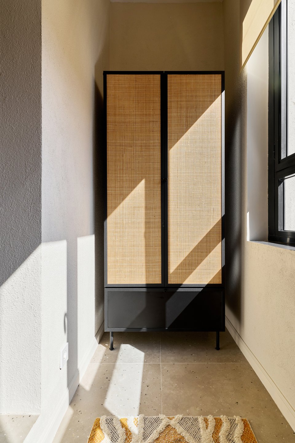 Прием: шкаф намеренно не стали проектировать до потолка. Такое решение визуально не перегружает пространство и избавляет от ощущения массивности.