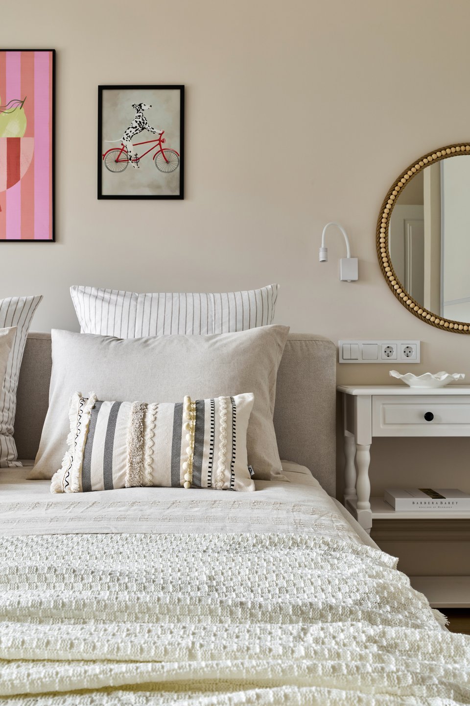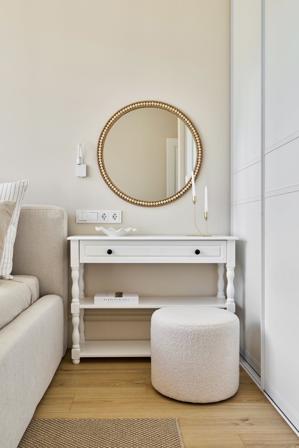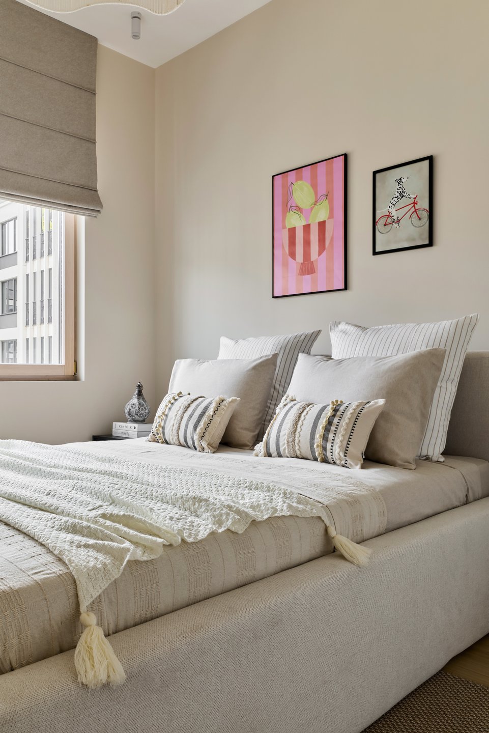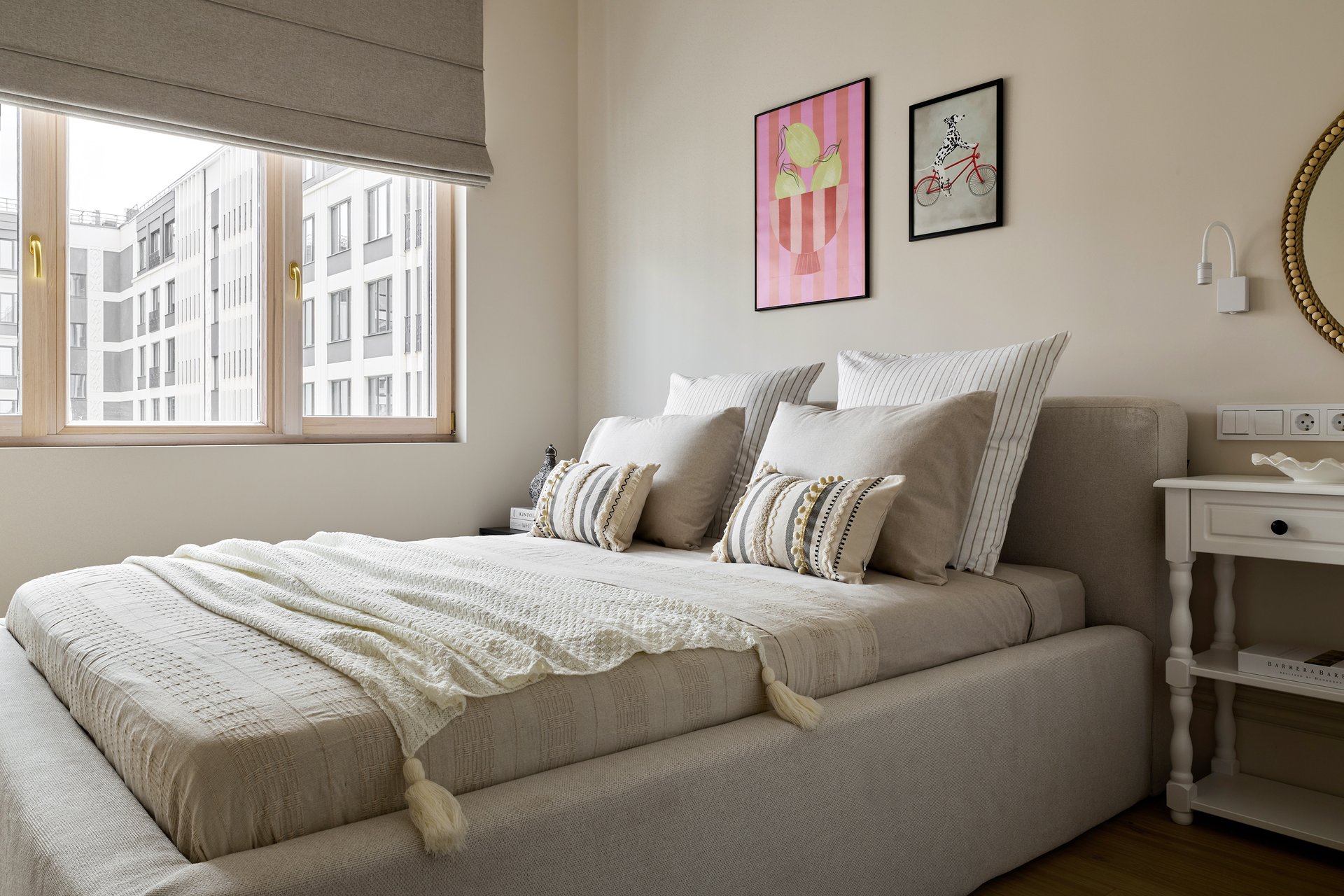 Кровать Фостер от divan.ru уютная и выразительная. Нам важно было создать ощущение наполненности пространства, поэтому выбрали модель с крупными царгами. Цвет обивки гармонично вписывается в универсальную светлую концепцию интерьера.